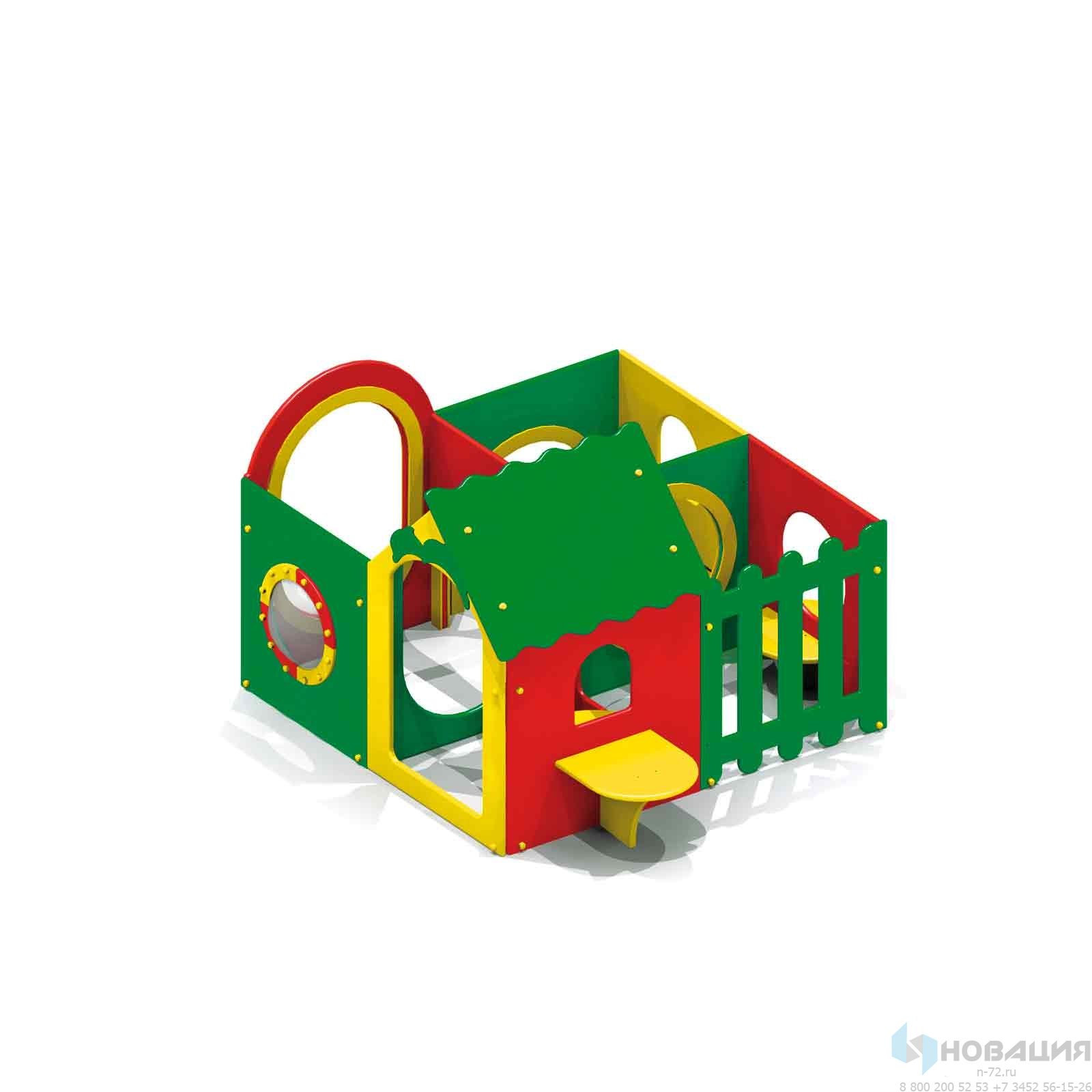 Игровой домик из 4-х квадратных секций оснащен переходами: арками, лазами круглой и овальной формы. Ограждения лабиринта выполнены в виде заборчика. Есть прозрачный иллюминатор, 1-скатная крыша с волнообразным нижним краем, столики и сиденья. Панели скрепляются оцинкованными уголками.