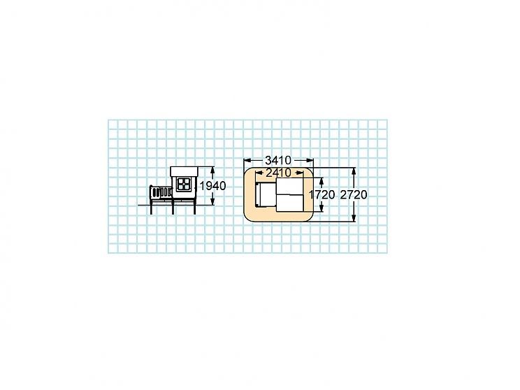 Конструкция включает в себя: беседку с 2-скатной крышей, 3 стенки с окошками и накладными деталями, полубашню, поручень, балконные перила, 2 скамейки.