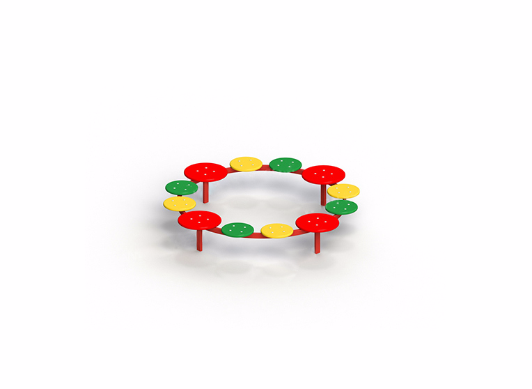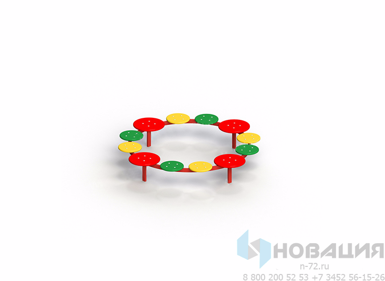 Дорожка для тренировки равновесия опирается на 4 стойки из труб сечением 50х25 мм. Вдоль окружности каркаса закреплены плоские цветные элементы (8 шт. с d 300 мм, 4 шт. с d 400 мм). Они служат островками для перешагивания, сиденьями или столешницами.