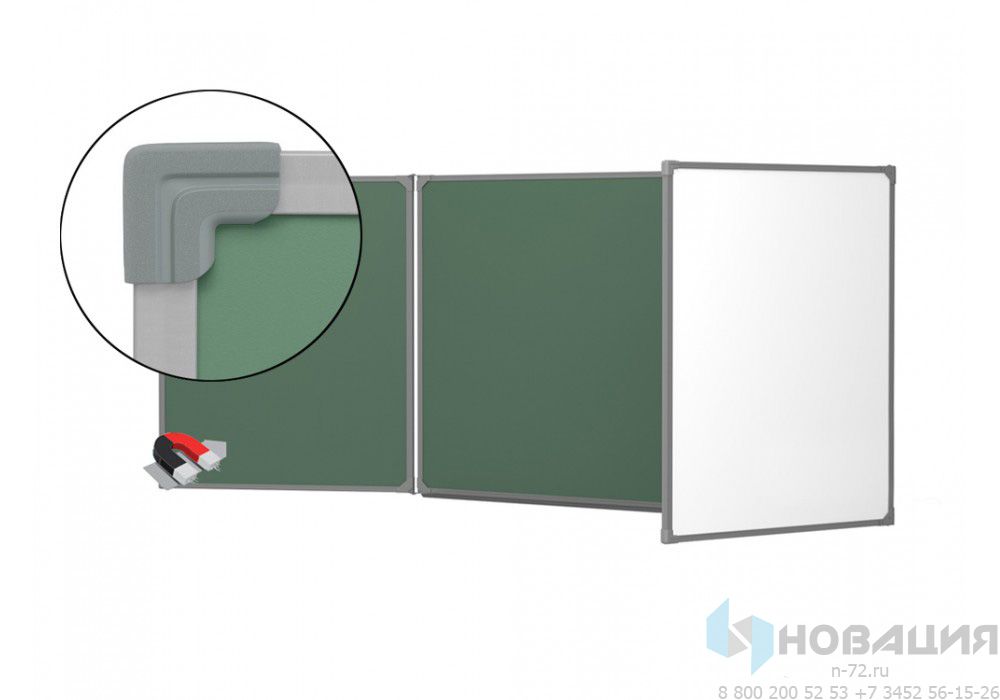 3-элементная доска для класса в школе позволяет писать мелом и маркерами. Конструкция состоит из 5-ти рабочих поверхностей, которые притягивают магниты.