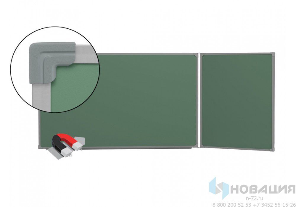 Настенная доска с подвижной секцией на петлях и 3-мя рабочими поверхностями устанавливается в школе. Стальные листы закрепляются в профиле из металла.