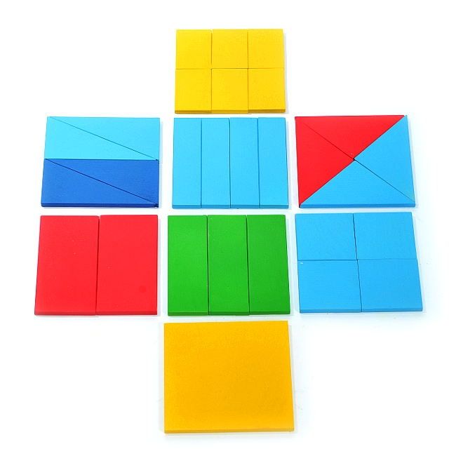В наборе представлены разноцветные элементы для изучения дробей. Пластины одного размера делятся на 3, 4 или 6 составляющих. Части выполнены в форме треугольников, прямоугольников и квадратов. Для сравнения есть цельная пластина, площадь которой условно принимается за единицу.