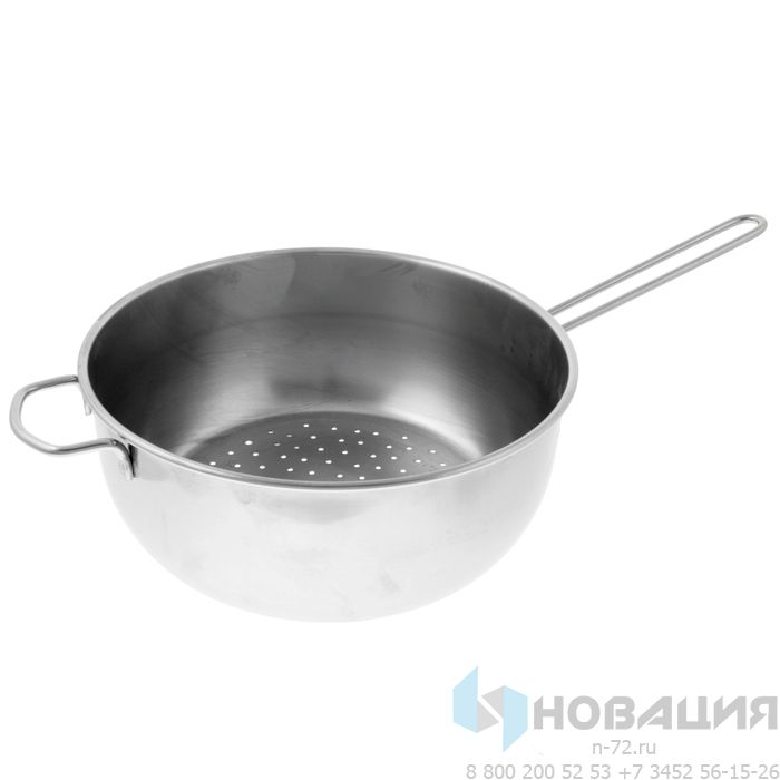 Дуршлаг необходим для промывания ягод, грибов, мелких фруктов и овощей, крупных зерен. Объемный дуршлаг с прутковой ручкой и держателем отлично подойдет для кухонь и столовых школ и детских садов.