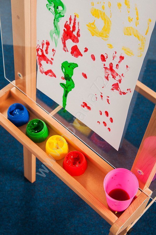 Мольберт устанавливается на ножки. Высота стекла регулируется. За мольбертом могут рисовать 2 ребенка одновременно. Рисунок, который выполнен на стекле, можно сохранить на бумаге. Для этого нужно приложить к свежей картинке лист ватмана. Если рисунок немного подсох, можно сначала слегка побрызгать на него водой, а затем приложить бумагу.