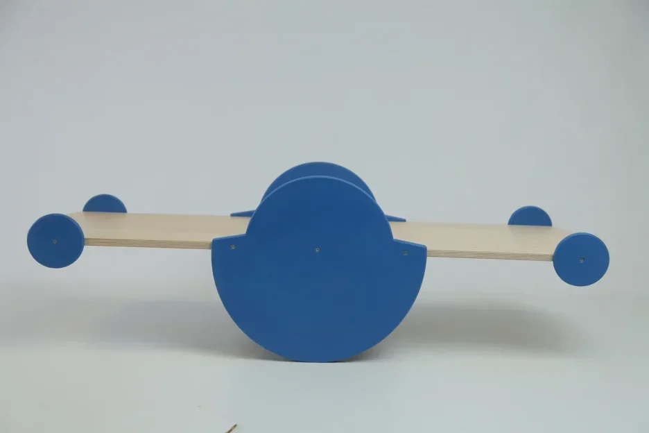 Балансир представлен 2-сторонней доской с 2-мя крупными центральными упорами в виде колес и 4-мя меньшими упорами (по 2 с каждой стороны). Качалка устойчива. Ребенок учится распределять вес тела таким образом, чтобы удержаться на платформе. Во время занятий тренируется вестибулярный аппарат.