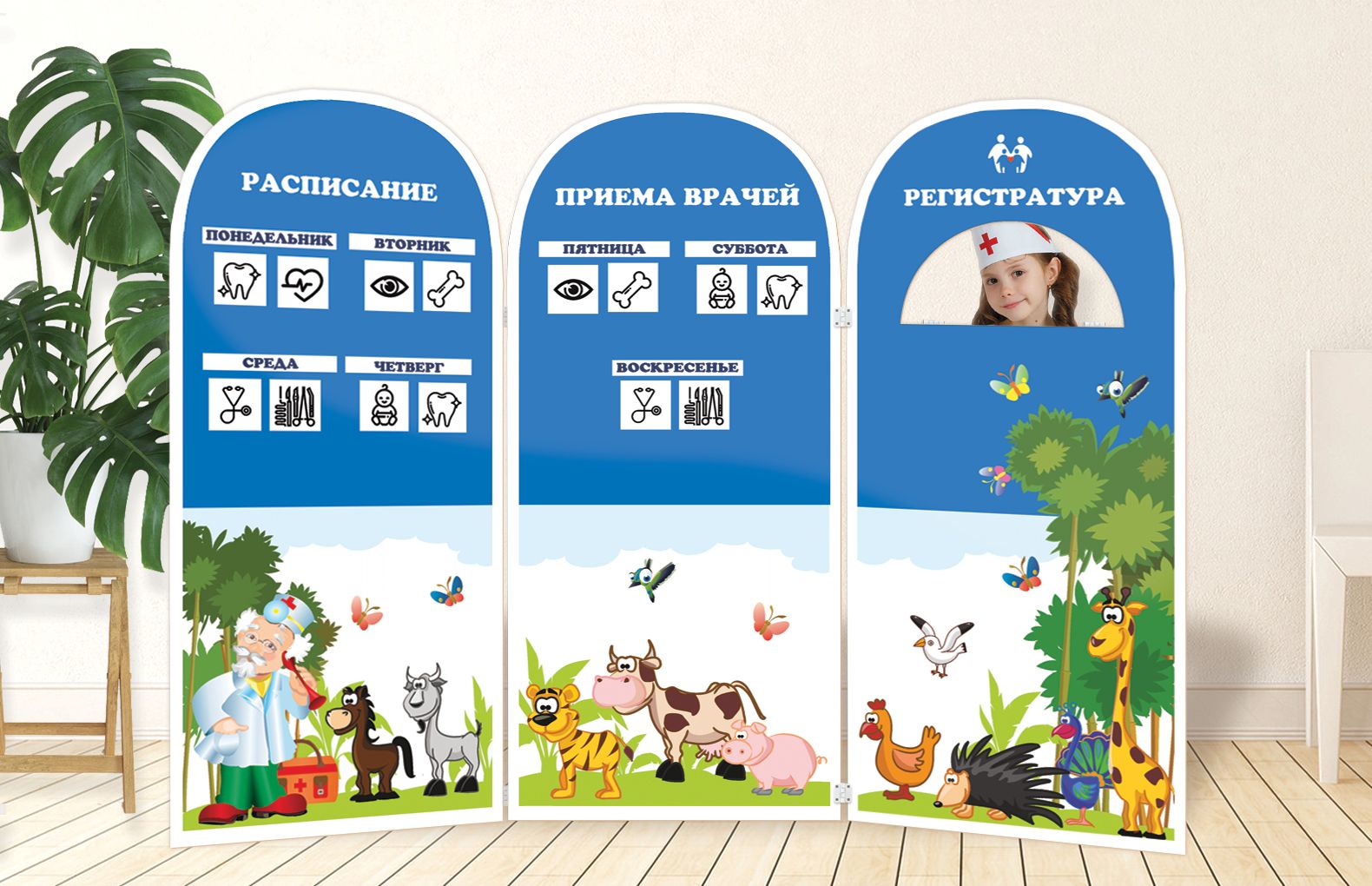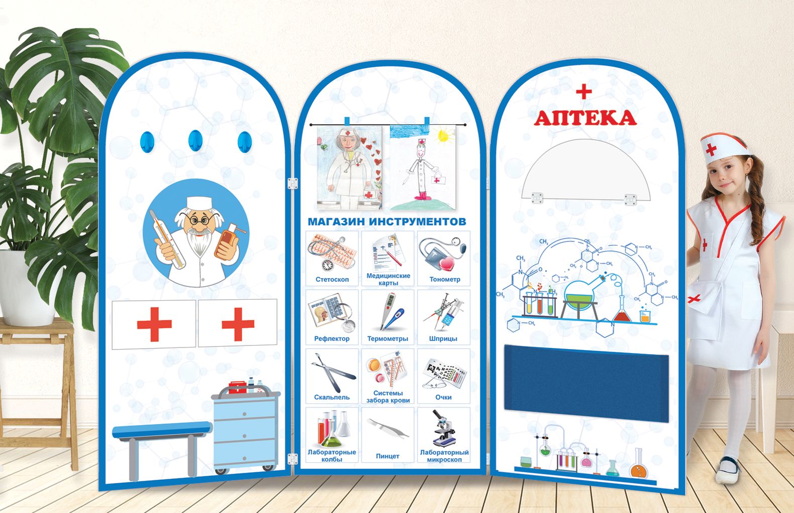 2 створки из 3-х оснащаются магнитной поверхностью. 1 сторона ширмы позволяет инсценировать работу регистратуры, 2 сторона для сценок с аптекой.