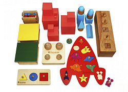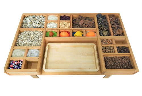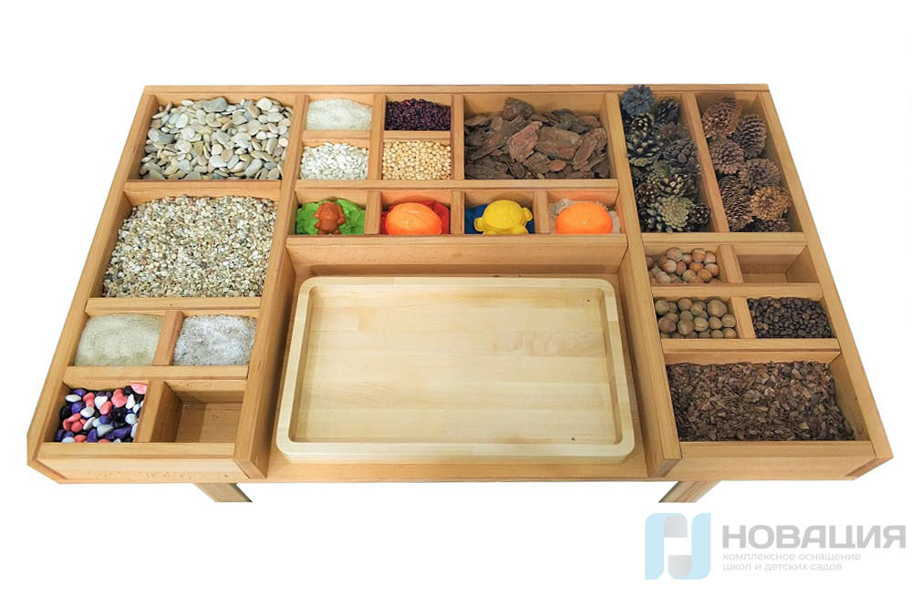 На поверхности стола 22 секции с различными природными сенсорными наполнителями. Ячейки закрываются крышками с отверстиями.
