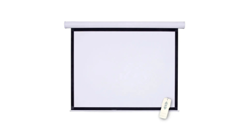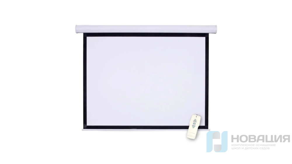 Экран оснащен универсальным креплением, которое позволяет устанавливать его как на стену, так и на потолок. Электропривод обеспечивает автоматическое открытие и закрытие полотна, управление осуществляется через пульт дистанционного управления.