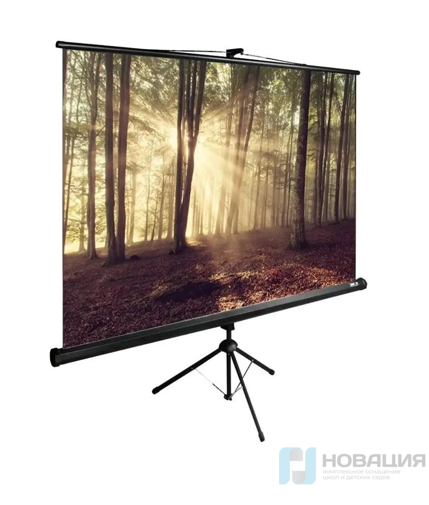 Экран предназначен для напольной установки и оснащен рулонной конструкцией, которая позволяет сворачивать экран при необходимости.
