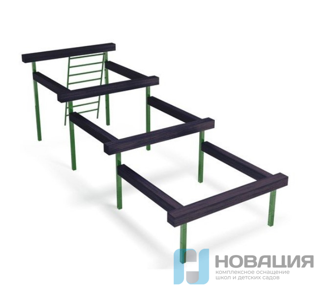 Лестница состоит из нескольких модулей, соединяющихся в одну конструкцию. На деревяные элементы наносится защитное покрытие, металлические опоры с лестницей окрашены полимерно-порошковой краской, устойчивой к воздействию неблагоприятных погодных условий и ультрафиолета.
