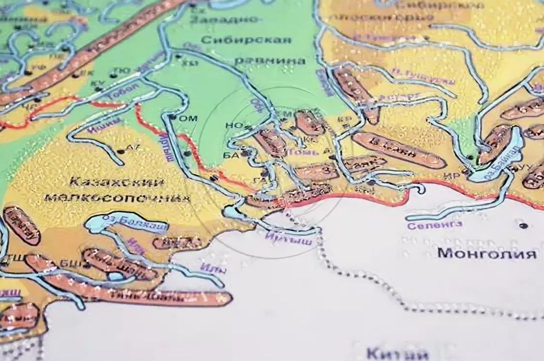 Прозрачная пленка для передачи информации тактильным методом совпадает с цветным изображением географических объектов. Названия городов представлены только плоскопечатным текстом.