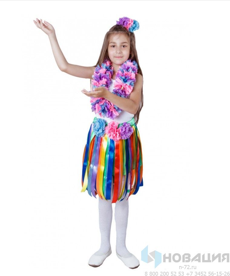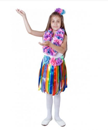 Костюм состоит из юбки с лентами, леи из искусственных цветов и головного убора на заколке-прищепке. Предназначен для детей дошкольного и младшего школьного возраста.