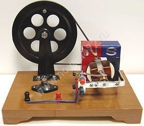 Ротор со стальным сердечником обмотан медным проводом. Концы провода подключены к коллектору. На противоположную ось ротора насажен шкив. Резиновый ремень соединяет его с приводным шкивом на стойках (движется при вращении ручки). Основание генератора оснащено клеммами и патроном с низковольтной лампой накаливания. Между ними параллельное соединение. Элементы подключены к щеткам коллектора, которые перемещаются вдоль контактов.