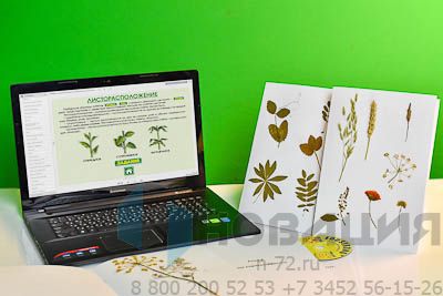Засушенные части растений (брусники, укропа, черемухи, клена, крушины, клубники, крапивы, липы и др.) приклеены на гербарные листы. Для каждой темы предусмотрено по 3 экземпляра листов.