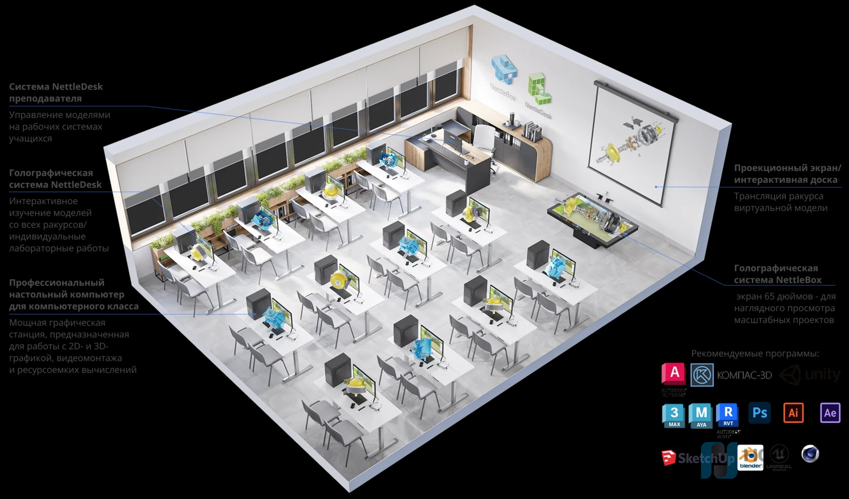 • Голографическая система NettleDesk ученика, для изучения моделей, выполнения лабораторных работ;