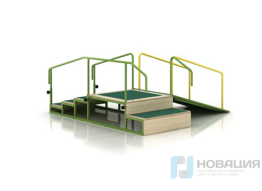 Горка со ступенями разной высоты и плоской наклонной поверхностью используется в ДОУ. Пандус и лестница окружаются поручнями, которые изменяются по высоте. Яркие цвета перил рассчитаны на слабовидящих. Влагостойкие ступени покрываются гипоаллергенным лаком. Ковровое покрытие не скользит. Оборудование предназначено для отработки навыков ходьбы, восстановления двигательной активности после травм или при ДЦП.