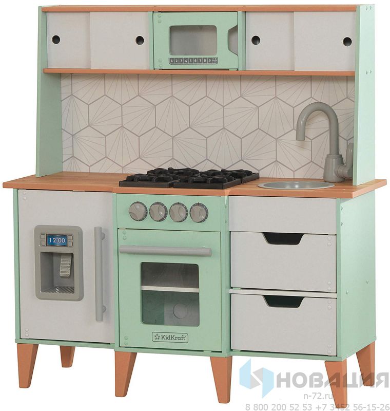 На рабочей поверхности кухни находятся варочная панель с 4 конфорками и раковина с краном. В нижней части игрового модуля располагаются духовой шкаф, холодильник и два ящика для хранения. Над столешницей есть полка с раздвижными дверьми и микроволновой печью. Все дверцы открываются, а ручки техники поворачиваются, издавая характерный щелчок. Конфорки оснащены подсветкой.