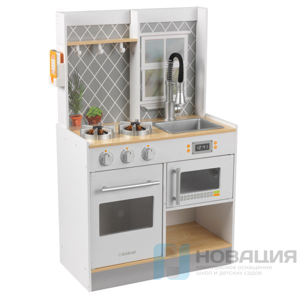 Модуль состоит из плиты с двумя конфорками и духовым шкафом, раковины, микроволновой печи и открытой полки. Игры с кухней помогут в развитии творческого мышления, воображения и моторики рук.