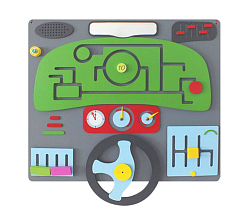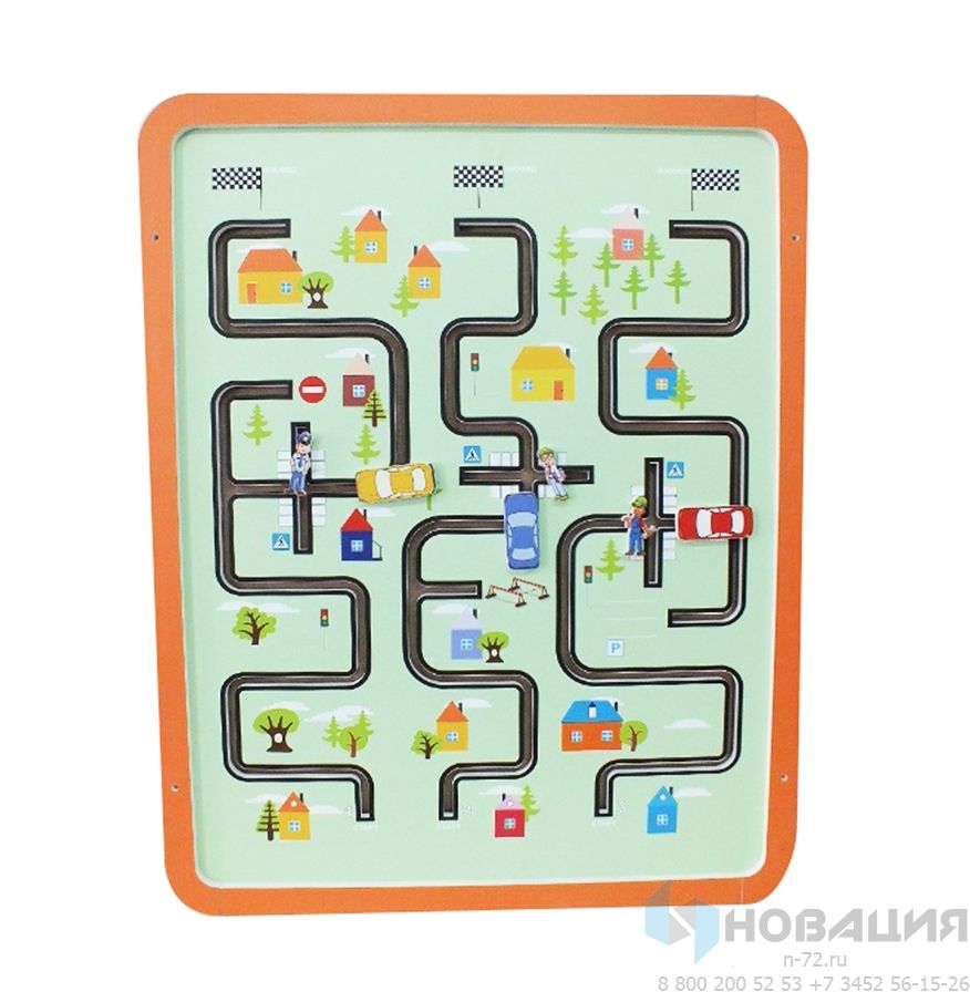 Игровое поле рассчитано на 3-х игроков. В процессе игры дети перемещают машинки и фигурки людей по дорожкам. Панель способствует развитию мелкой моторики, помогает улучшить коммуникативные навыки.