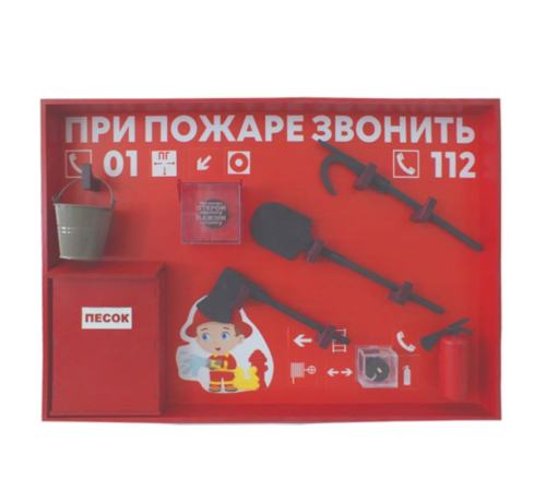Настенная панель представлена в виде пожарного щита, оснащённого подвижными игровыми элементами: