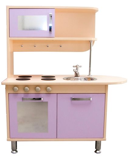 Игровая зона в ДОУ помогает организовать развивающие занятия. В наличии 3 закрытых бокса, имитирующих духовой шкаф, микроволновку и тумбу, панель с крючками, полуоткрытая полка, имитация раковины со смесителем и плиты. Декоративные детали изготавливаются вручную, тщательно обрабатываются. Конструкция воссоздает обстановку настоящей кухни. Дети запоминают названия приборов, учатся выполнять повседневные задачи.