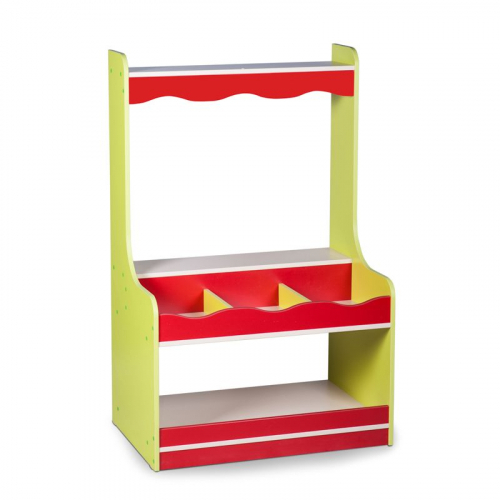Игровая зона "Магазин Чиполлино" имеет открытый прилавок  разделенный на ячейки для игрушечных овощей, фруктов и других товаров. Подходящий вариант оснащения игровой комнаты в ДОУ.