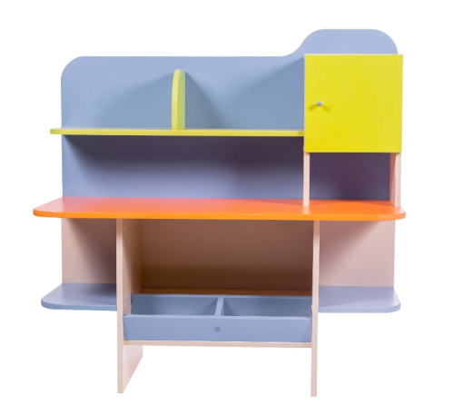 На полках, закрепленных под столешницей и над ней, распределяются инструменты и материалы, при помощи которых дошкольник представляет себя мастером.