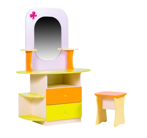 Зона для игры представлена 2-мя выдвижными ящиками, овальной столешницей, 5-ю открытыми полками и нишами, настоящим зеркалом с обработанной кромкой, а также отдельно стоящим предметом мебели — стульчиком (все края конструкции скруглены).