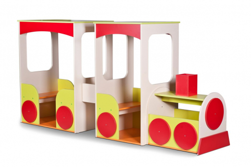 "Паровозик" — это оригинальный игровой модуль для коллективной игры в ДОУ. Конструкция представлена 2-мя крытыми блоками-вагонами, которые соединены деревянными элементами, и локомотивом. В общей сложности в "Паровозике" 6 мест для сиденья с нишами, под сиденьями можно хранить игрушки. Локомотив состоит из полки, декоративной передней панели и ящика-бокса открытого типа.