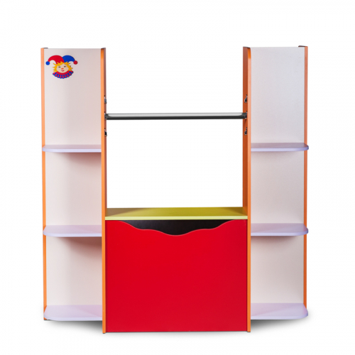 Оснащен стеллажами с полками и  нишей с распашными дверцами, в которой удобно хранить куклы и аксессуары. Планка для закрепления занавесок регулируется по высоте.