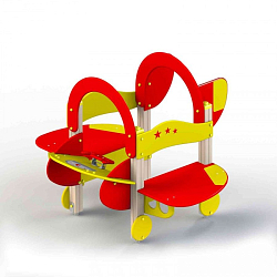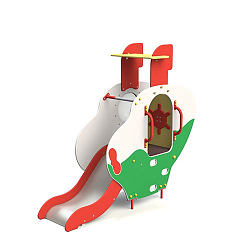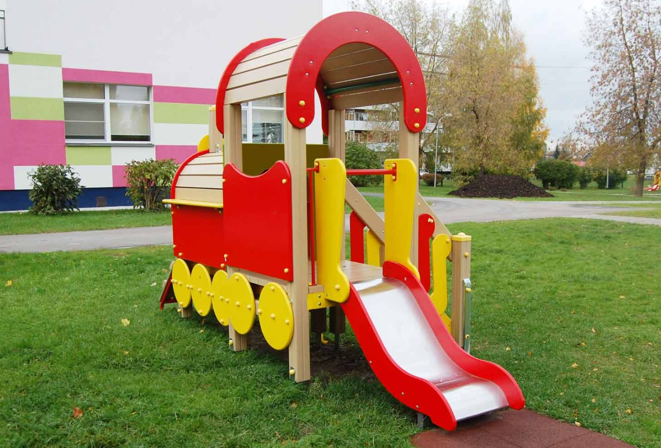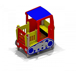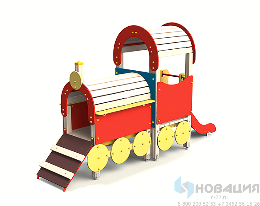 Стилизованный комплекс пробуждает фантазию ребенка. Сходство с локомотивом придают декоративные детали: имитация выпускной трубы, колес, прожектора. Облик довершают карнизы на ограждениях, арочный навес. Крыши с округлыми контурами выполнены из фанеры, устойчивой к воздействию осадков.