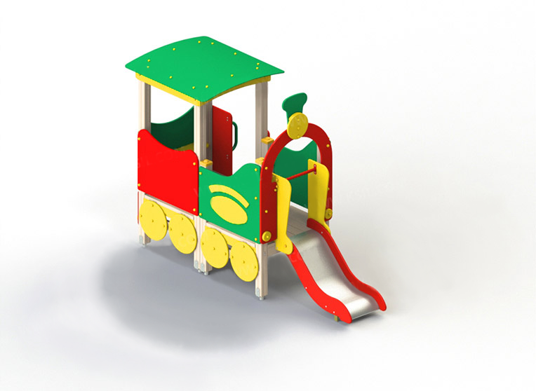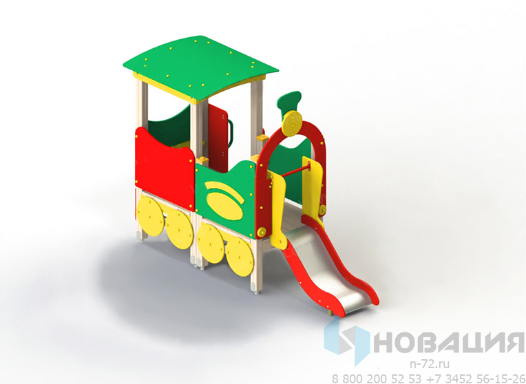 Детская горка в виде паровозика устанавливается на территории начальной школы или детского сада.