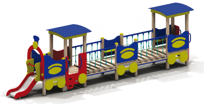 Стилизованный комплекс оформлен в виде паровоза. Дополнен имитацией колес, прожектора, выпускной трубы. На ограждениях фигурные накладные элементы. Над горкой декоративная арка. В башнях с полом из досок предусмотрены входы. При подъеме нога ставится в отверстия на боковых панелях.