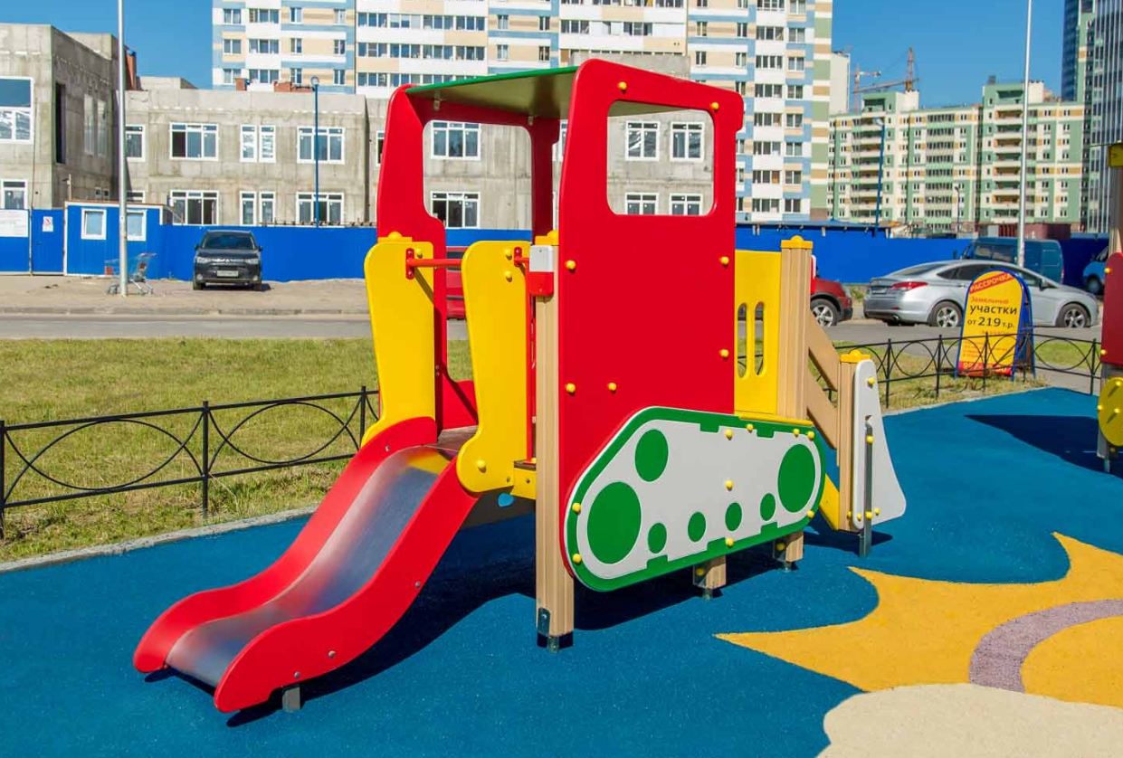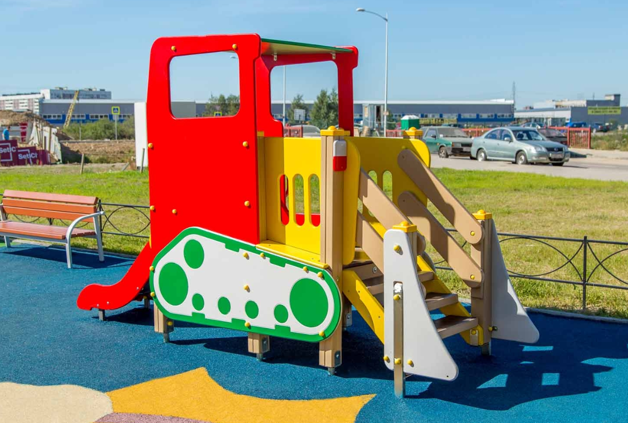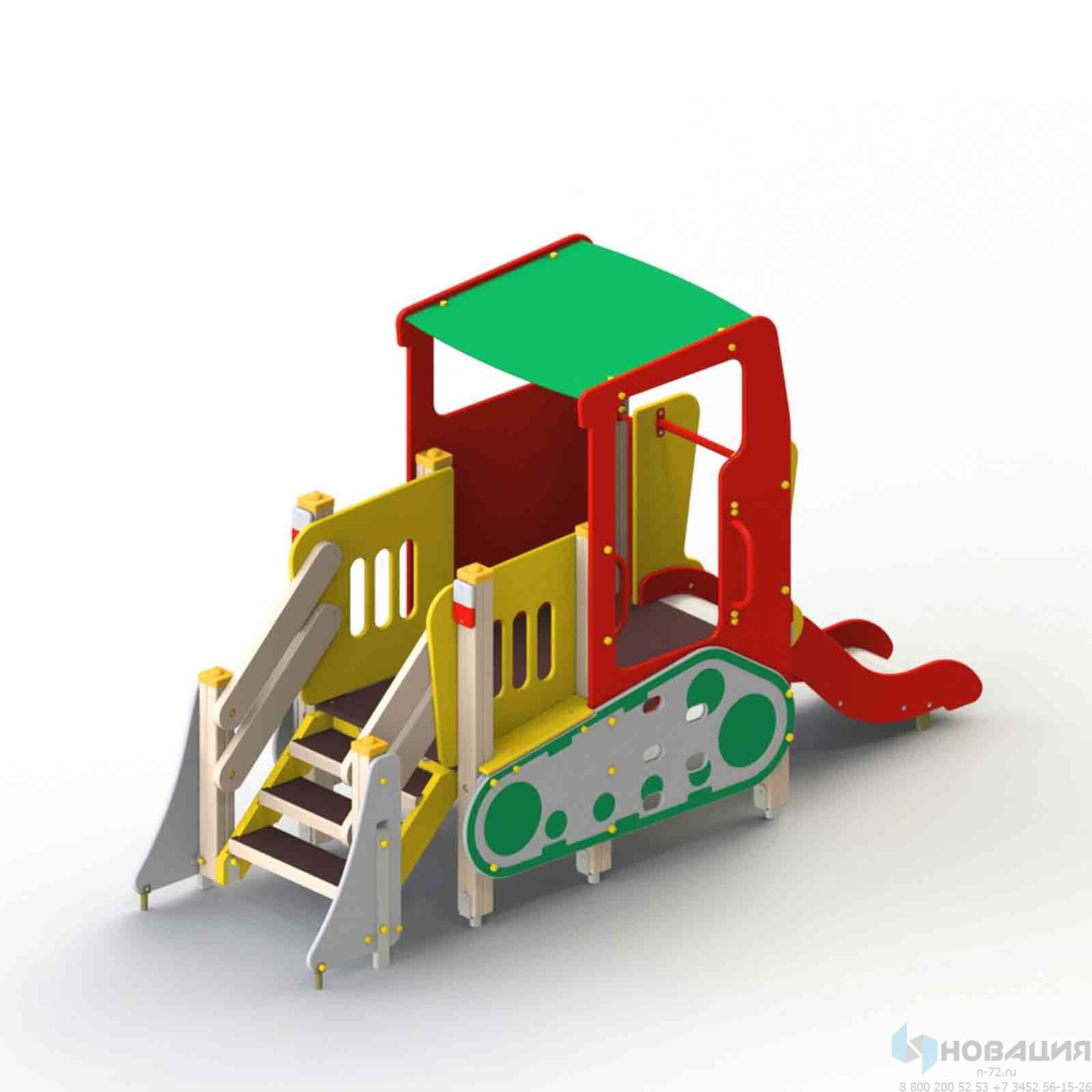Комплекс оформлен в виде бульдозера. На боковых стенках есть вход и окошко. Под ними накладные детали с имитацией гусениц. Нескользящую лестницу дополняют укрепленные перила.