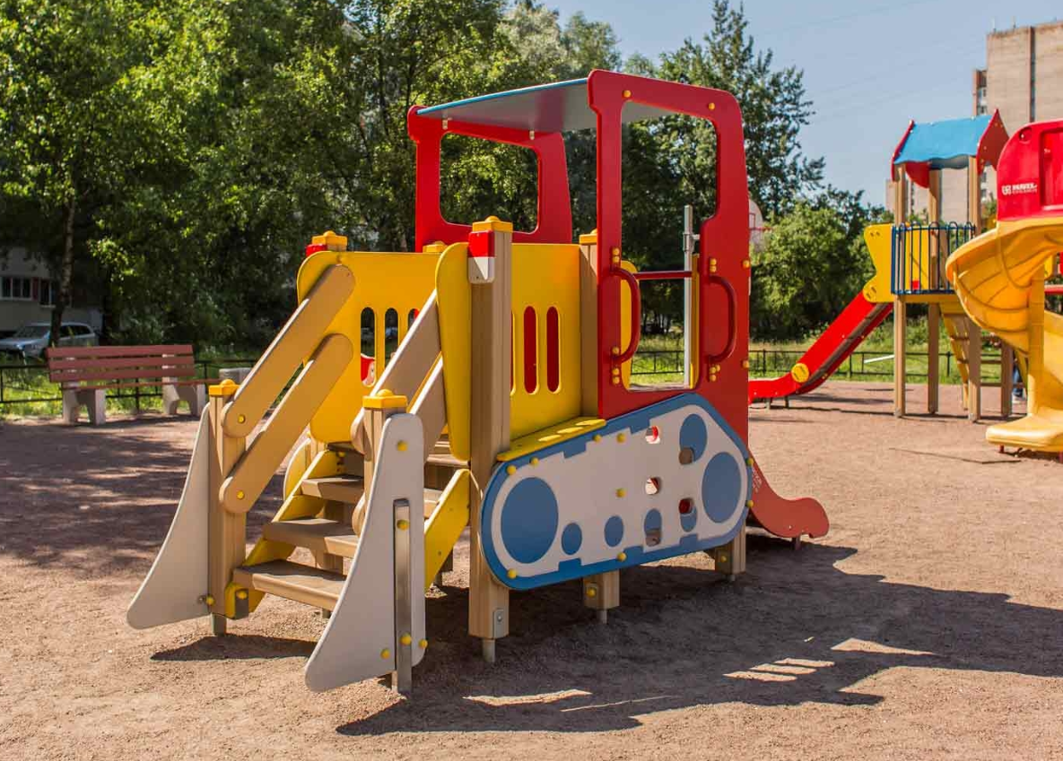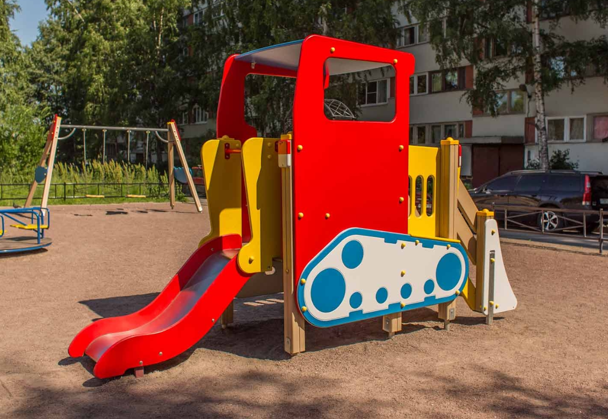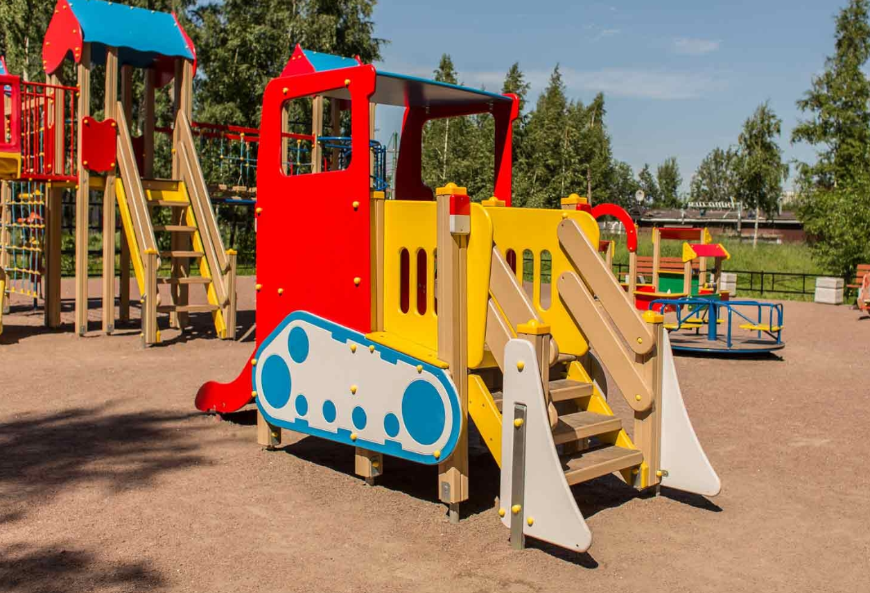 Комплекс оформлен в виде бульдозера. На боковых стенках есть вход и окошко. Под ними накладные детали с имитацией гусениц. Нескользящую лестницу дополняют укрепленные перила.