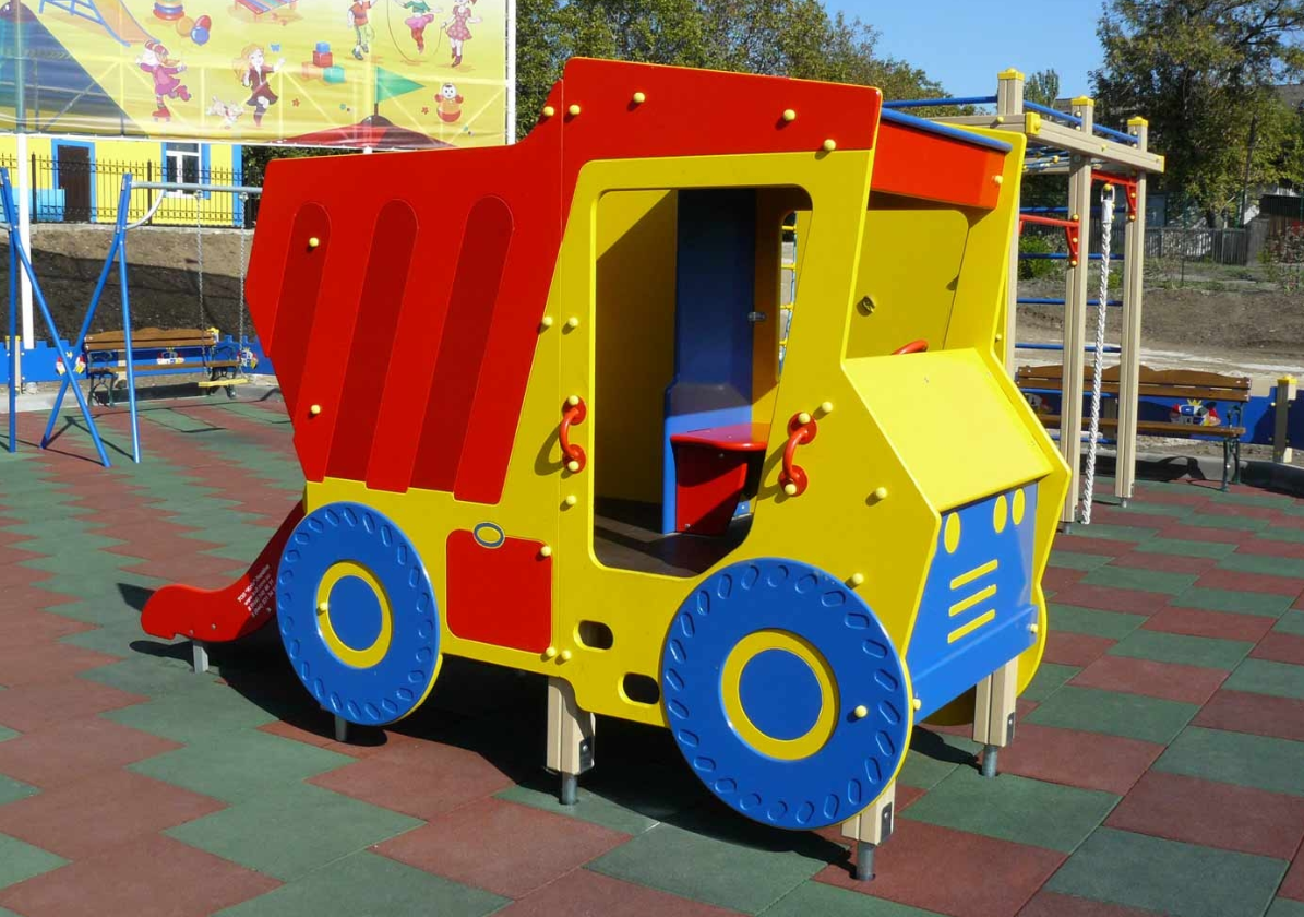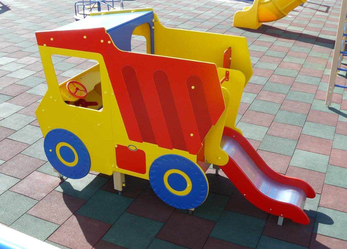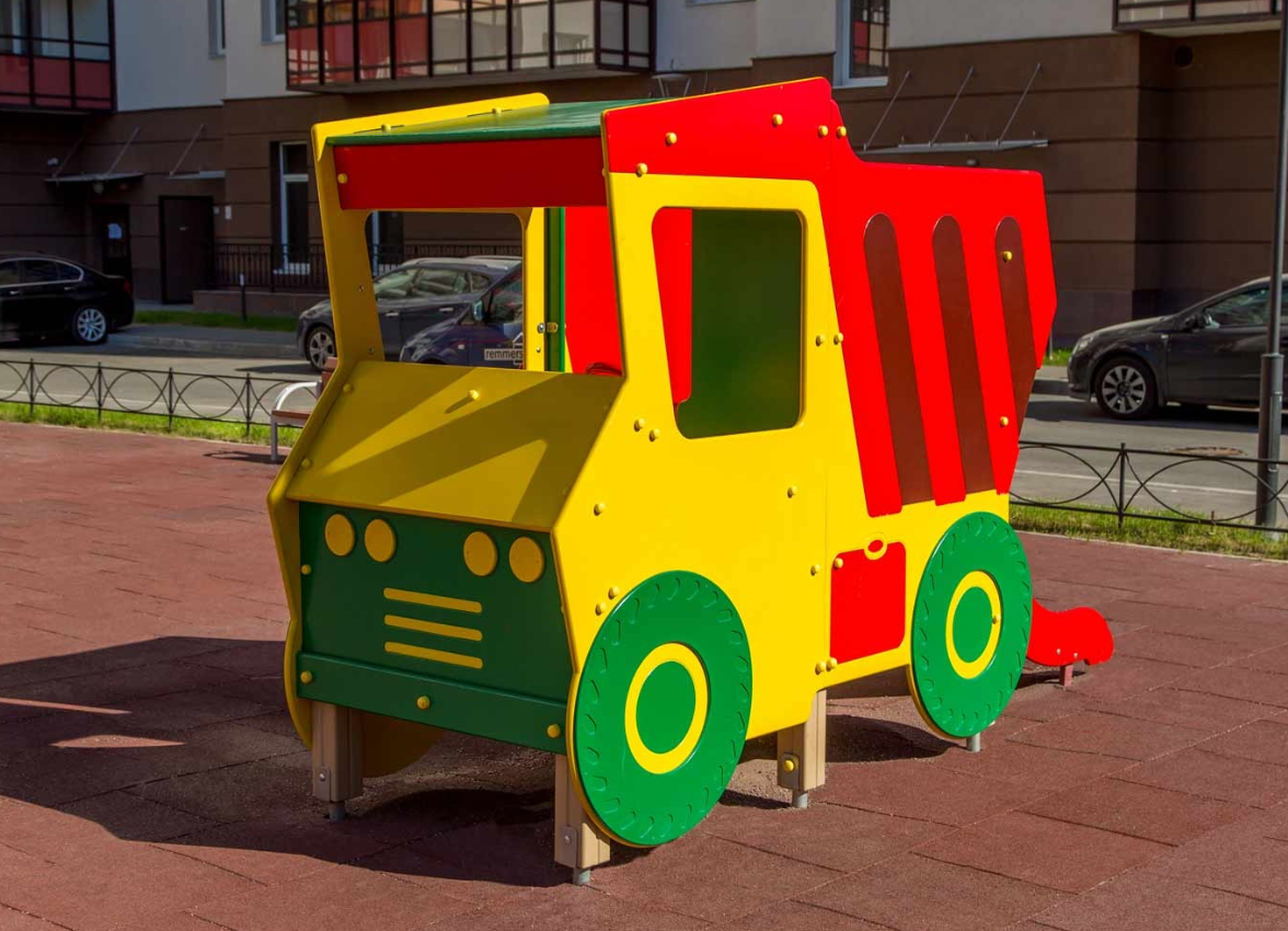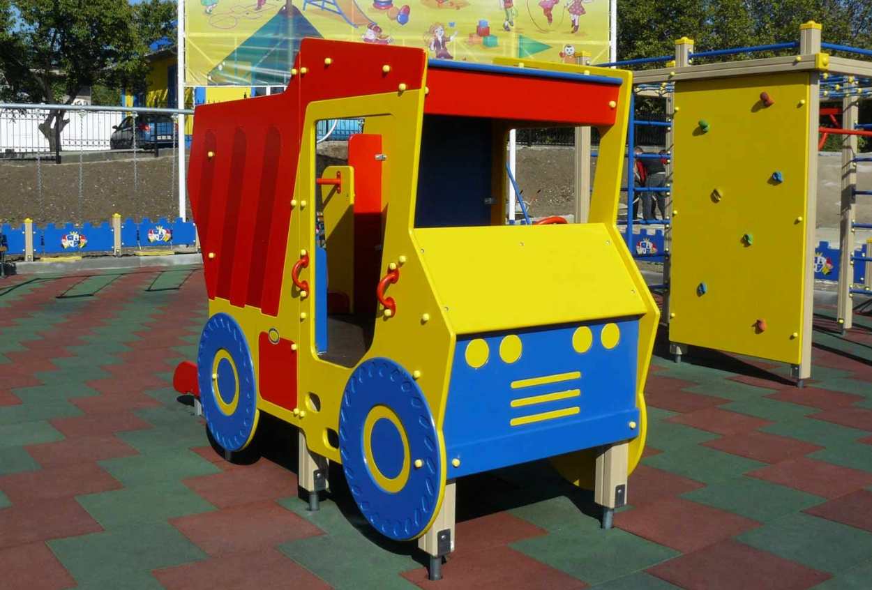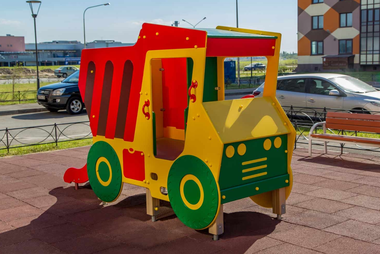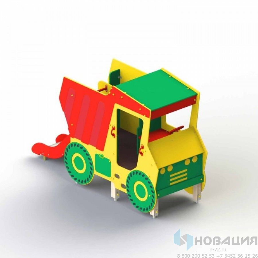 На стенках передней башни есть вход и окошки. В оформлении задействуются: имитация руля, рычага передач, решетки радиатора, фар, колес. В кабину ребенок поднимается с помощью поручней. На боковых панелях предусмотрены отверстия для ног.