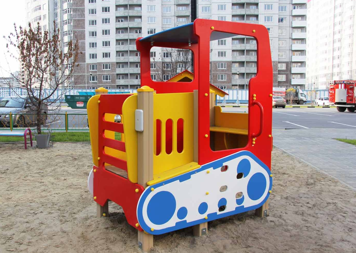 Игровой элемент представлен в форме трактора: на боковых стенках есть вход и окошки, а также накладные детали в виде гусениц. Передняя часть украшена декоративными фарами и решетками радиатора. Под окном на задней стенке скамья. В комплекс без лестницы ребенок поднимается, держась за поручни.