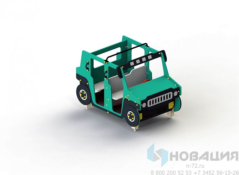 Конструкция включает в себя: несущие столбы, кабину, кузовные детали, поручни, колеса, крутящийся руль, сиденья со спинками, металлическая дуга на крыше.