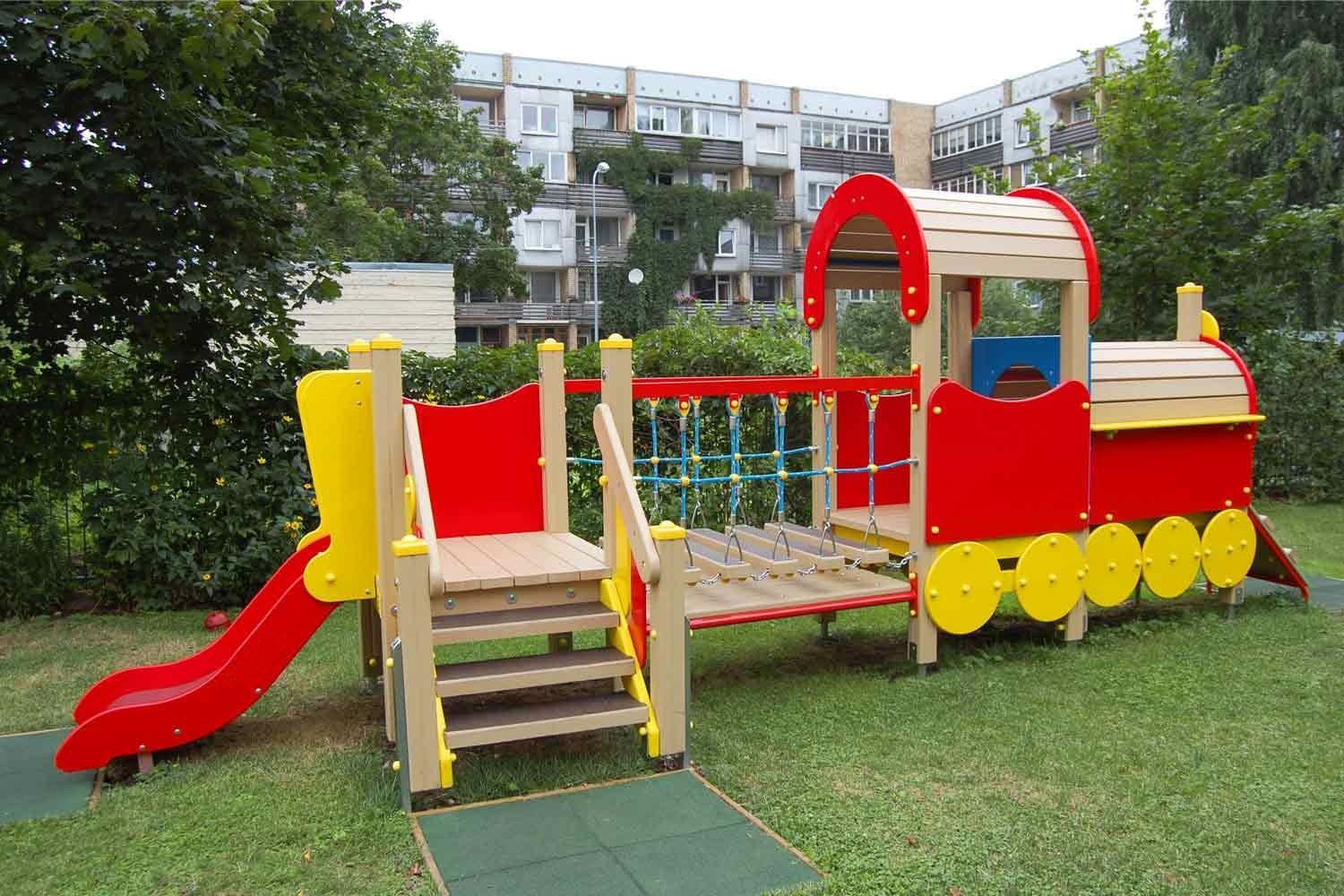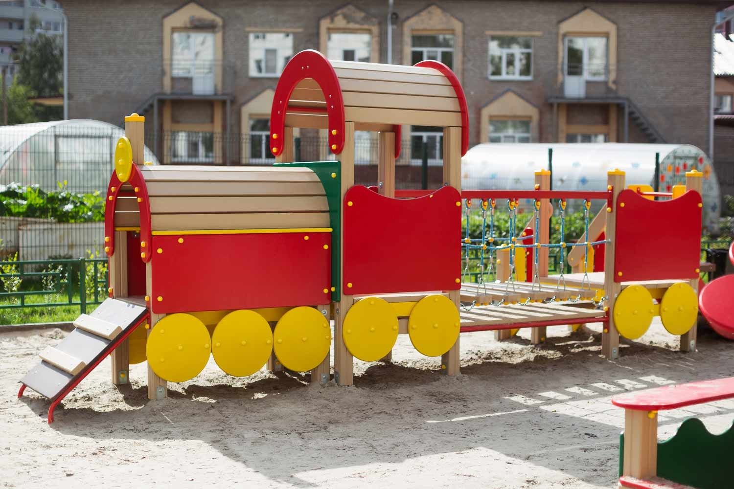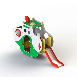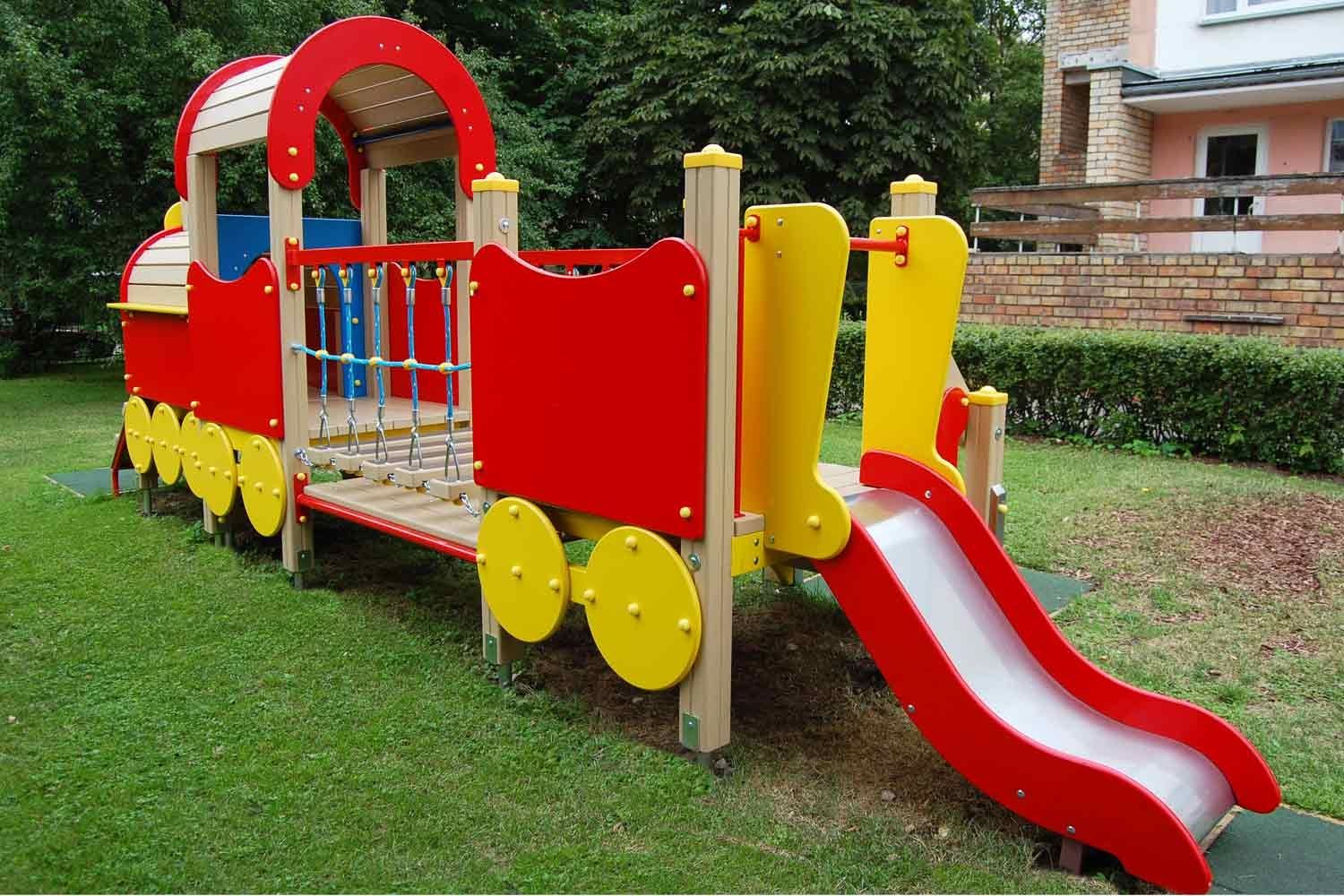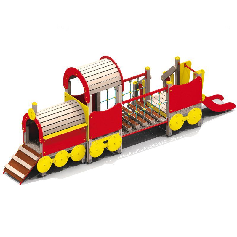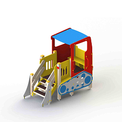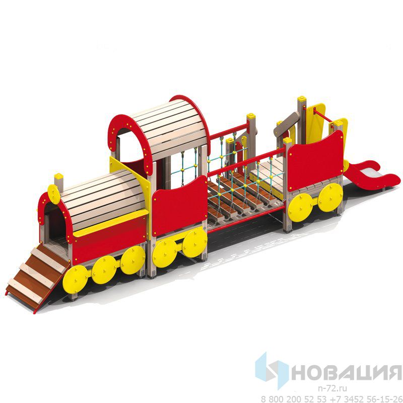Игровая зона оформлена как локомотив с вагоном: ее украшает имитация прожектора, выпускной трубы, колес. Конструкция дополнена арочным навесом, карнизами на ограждениях.