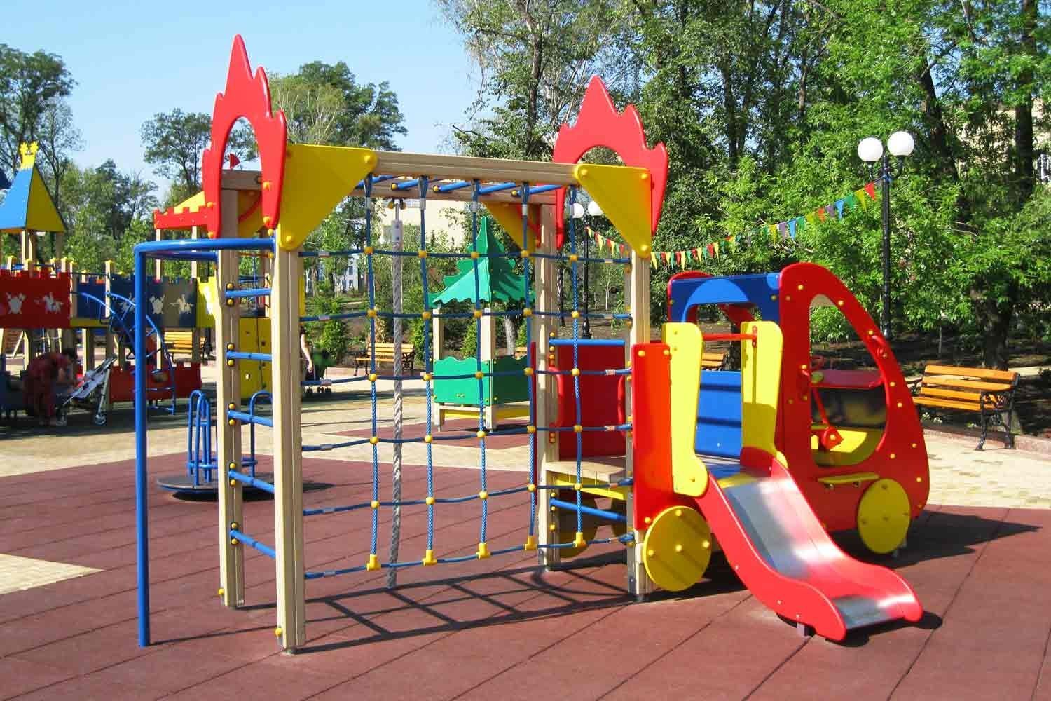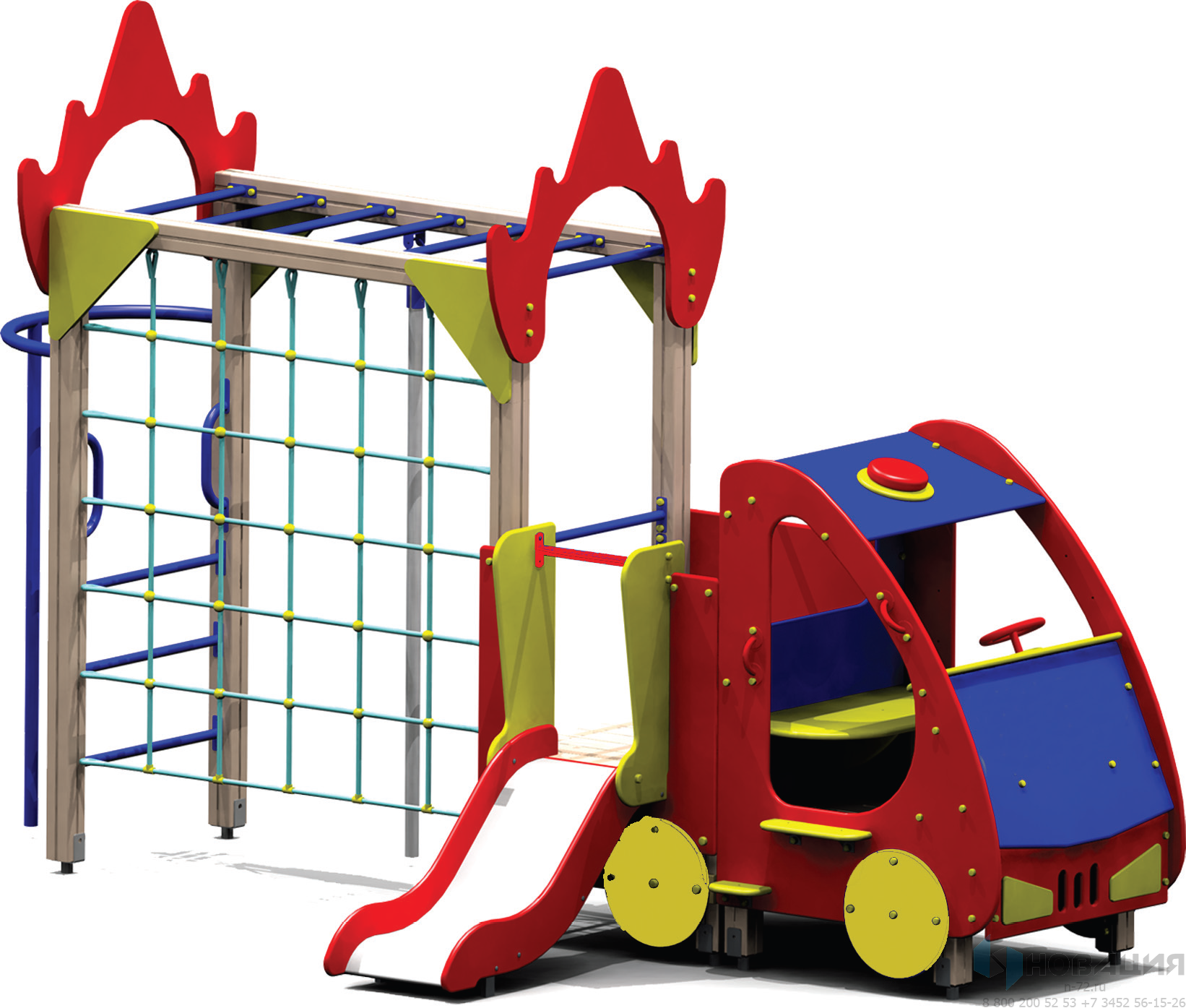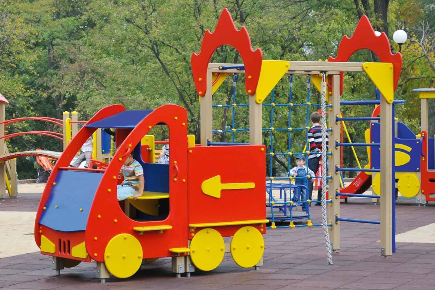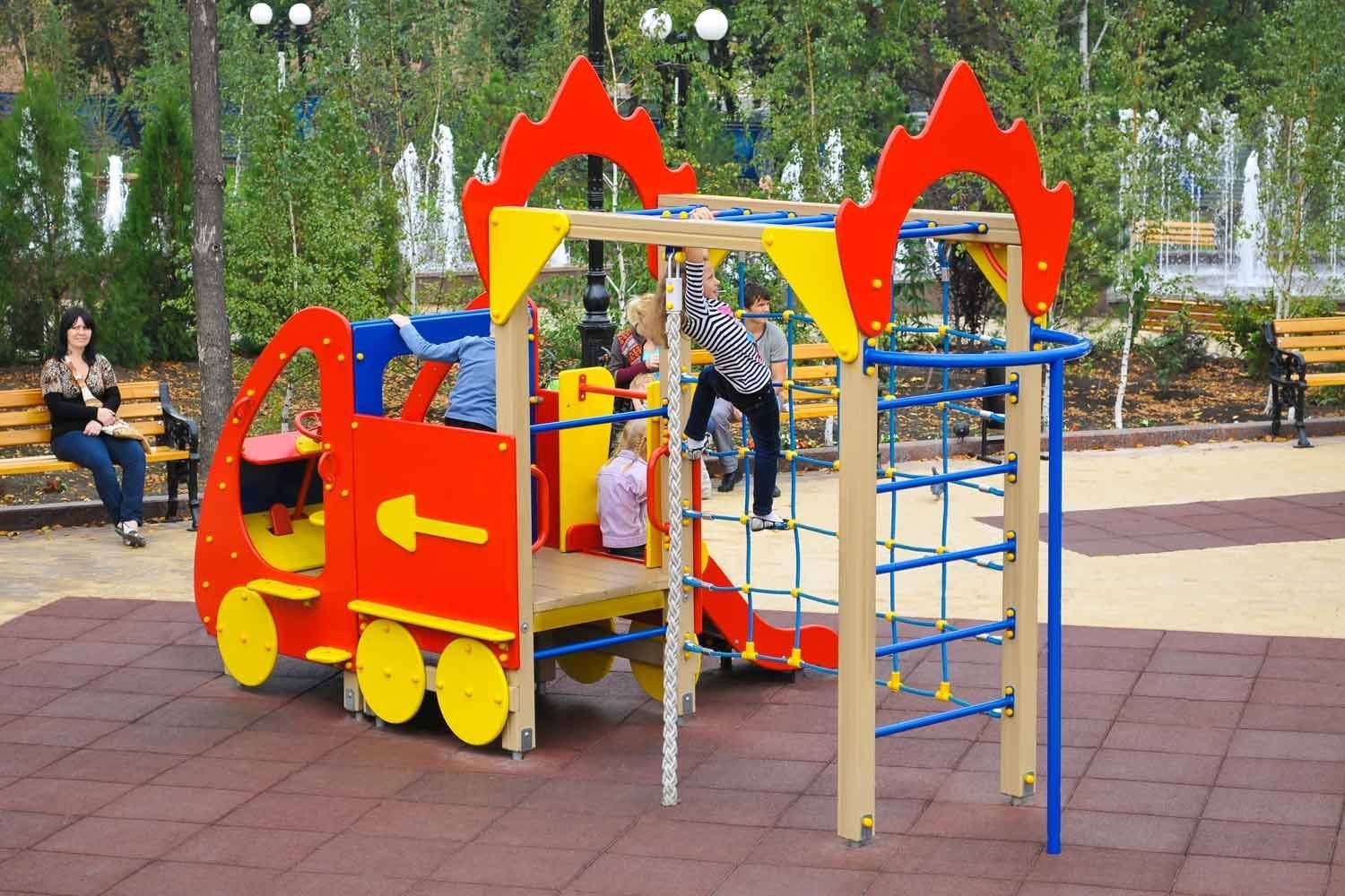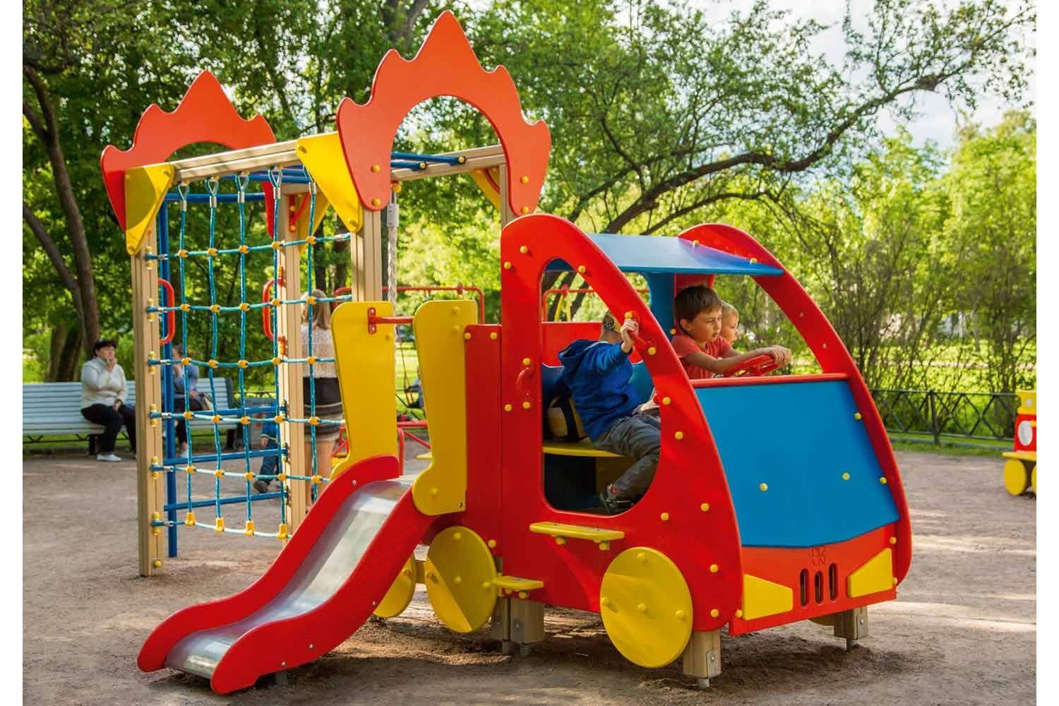 Игровое оборудование представлено имитацией пожарной машины и гимнастическим комплексом. Всепогодные конструкции устанавливаются на территории начальной школы или ДОУ.