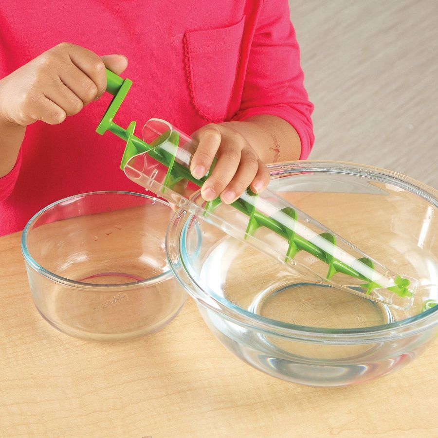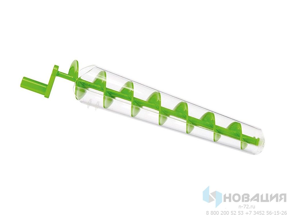 Изделие располагается под углом к горизонтальной поверхности и погружается в емкость с водой, грунтом или песком. Через нижний конец трубка наполняется материалом. Ребенок двигает мягкую рукоятку, наполнитель перемещается вверх по спирали и выходит из вершины трубки.