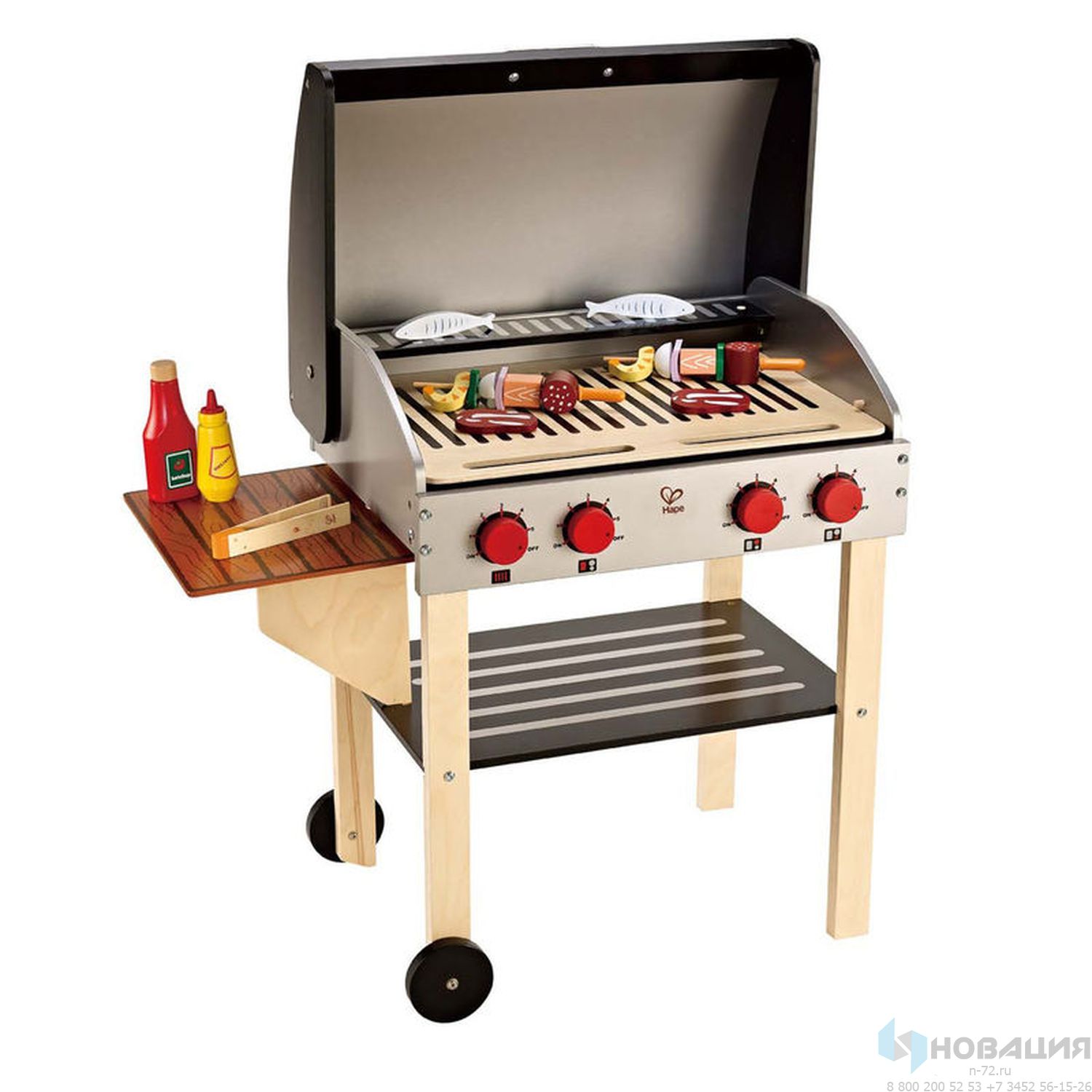Гриль оснащён двухсторонними решётками, складным боковым столом, подвижными колесами и открывающейся и закрывающейся крышкой. Игрушка издаёт реалистичные звуки.