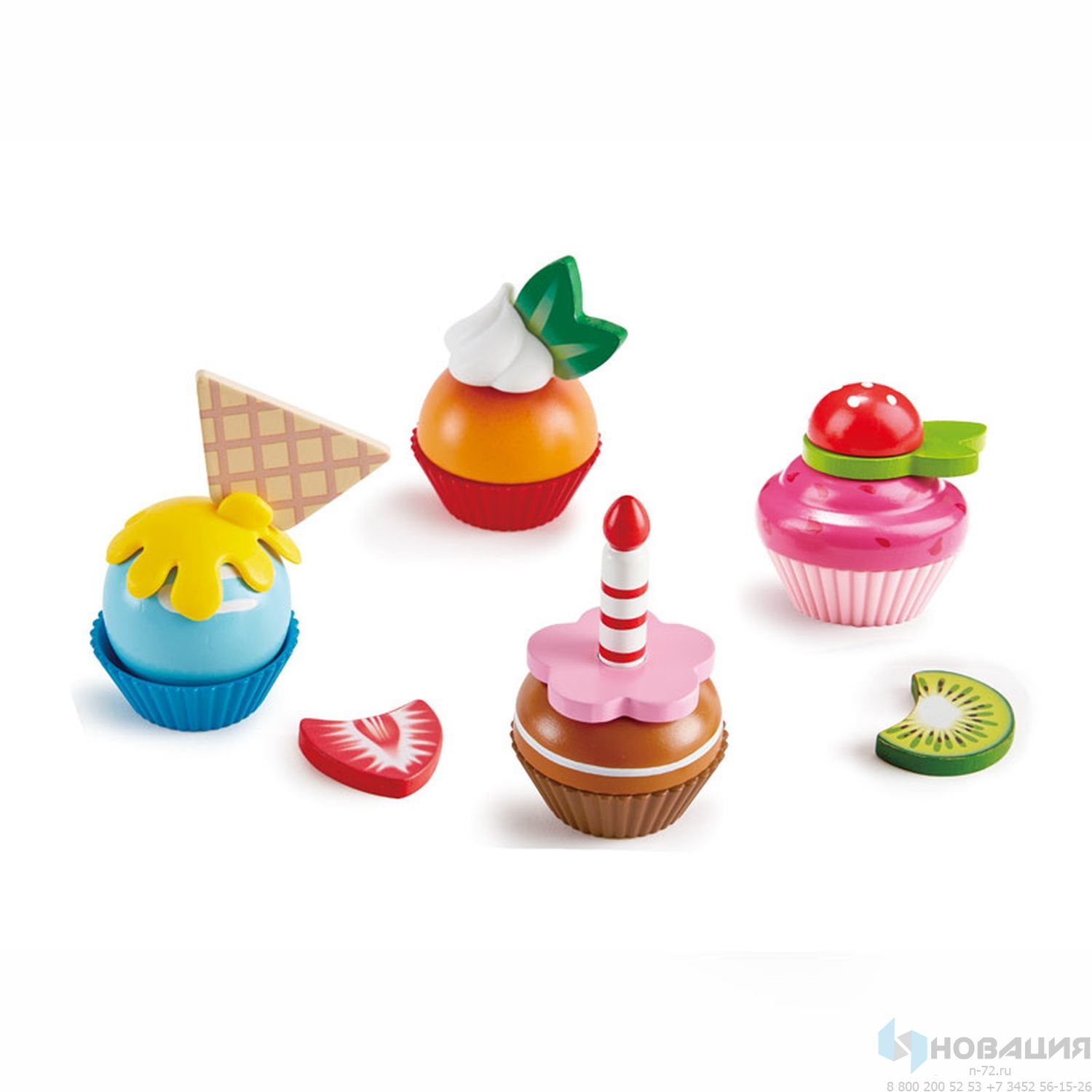 Набор состоит из 18 предметов, включая четыре игрушечных кекса и различные элементы для начинки и украшения: свечу, фрукты, вафлю. Набор можно использовать в обучающих играх, стимулирующих интерес к готовке.