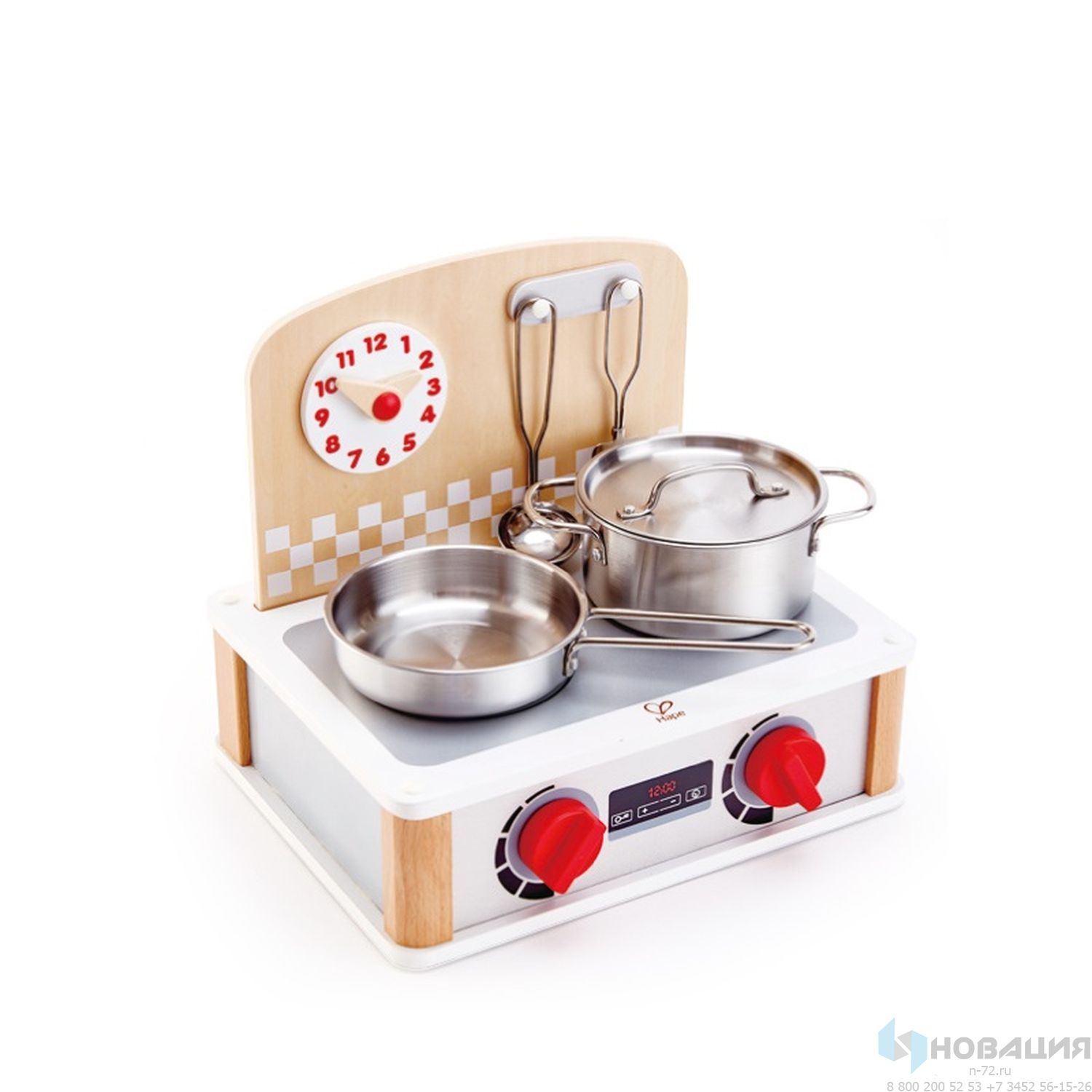 Ручки конфорок издают реалистичный звук щелчка. На крючках над варочной поверхностью можно разместить лопатку и половник.