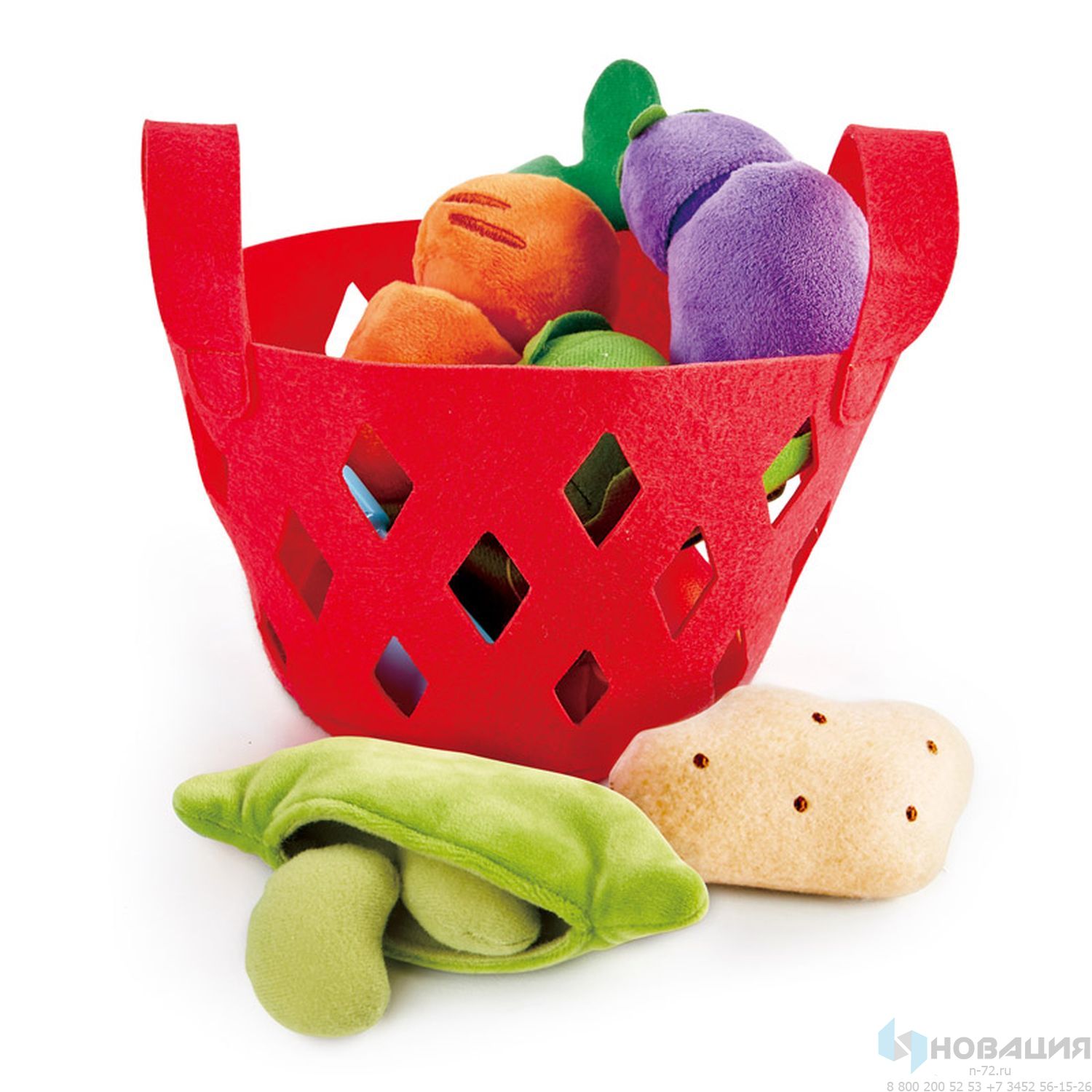 Набор представляет собой корзину с войлочными игрушками в виде популярных овощей: картофель, капуста, морковь, помидор, баклажан, стручковая фасоль. Также в комплект входит игрушечный ножик. Подходит для изучения форм и цветов и развития тактильного восприятия, мелкой моторики, координации рук и глаз, навыков сортировки.