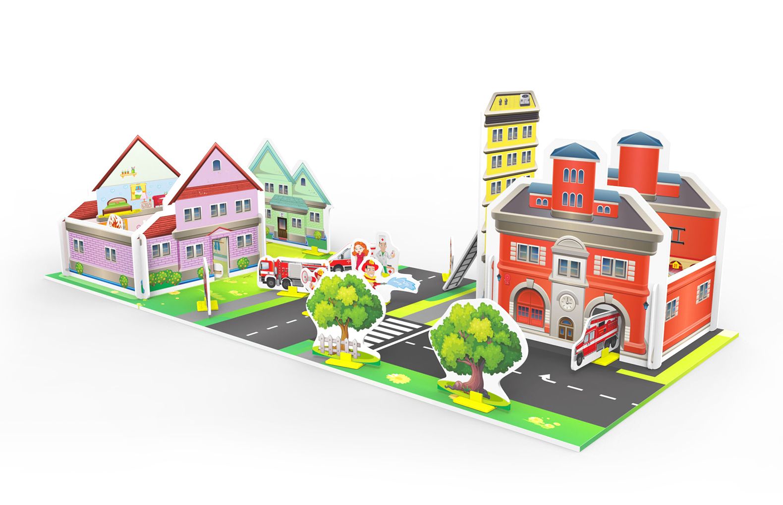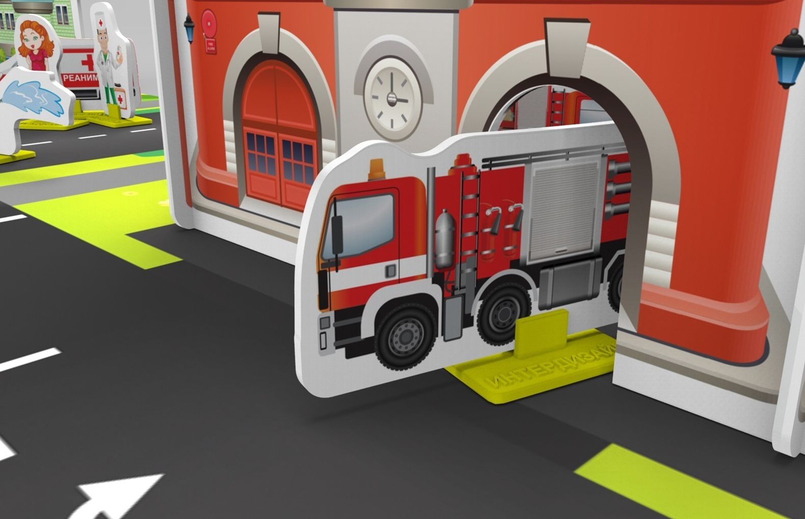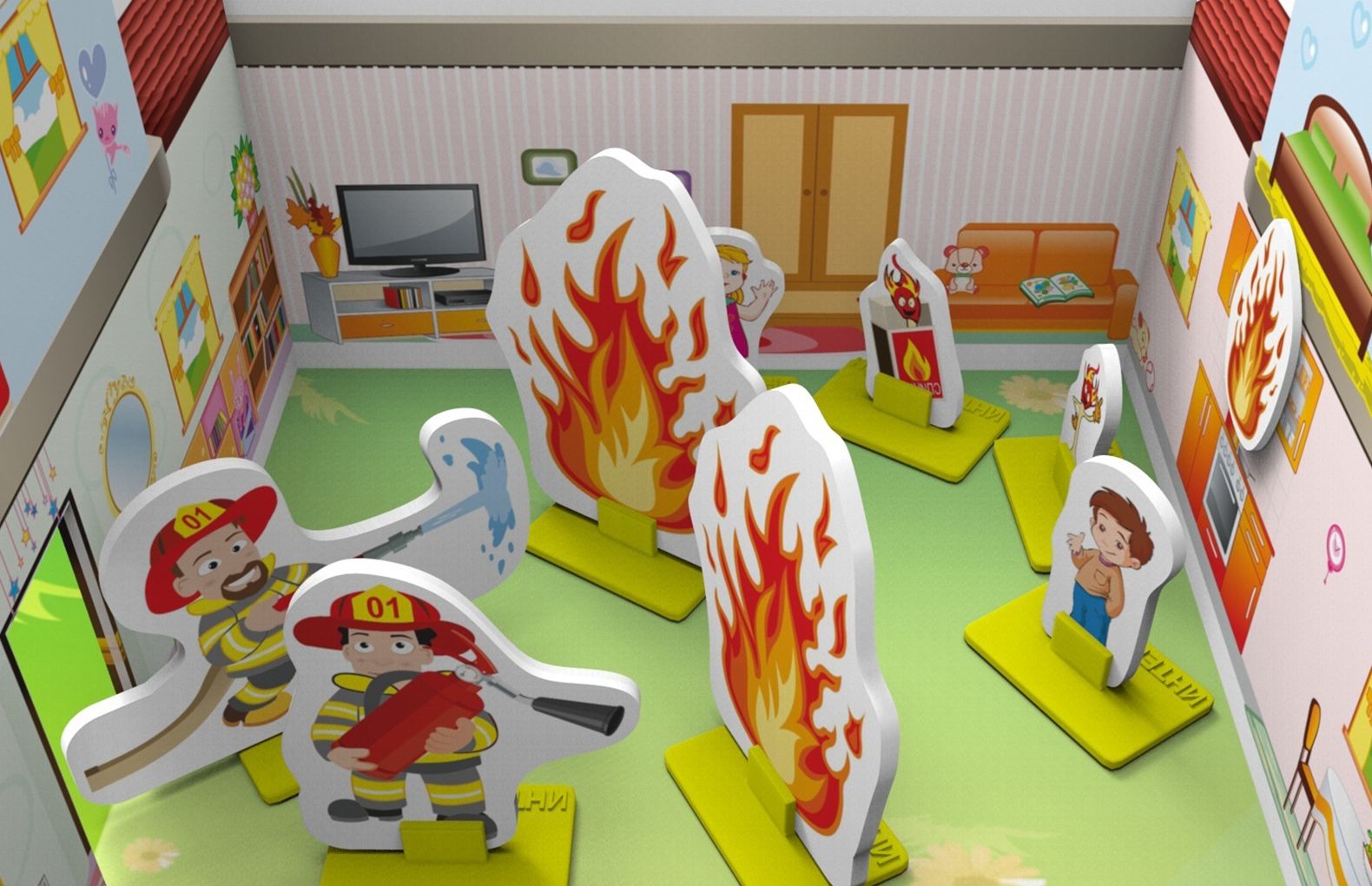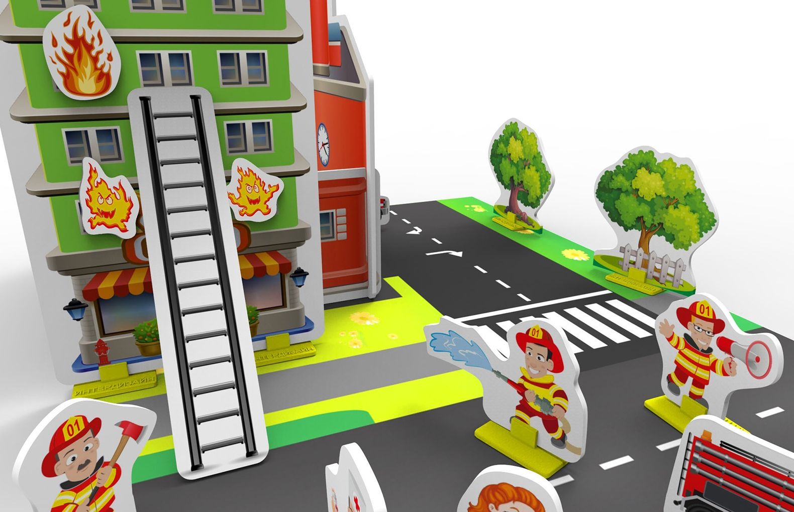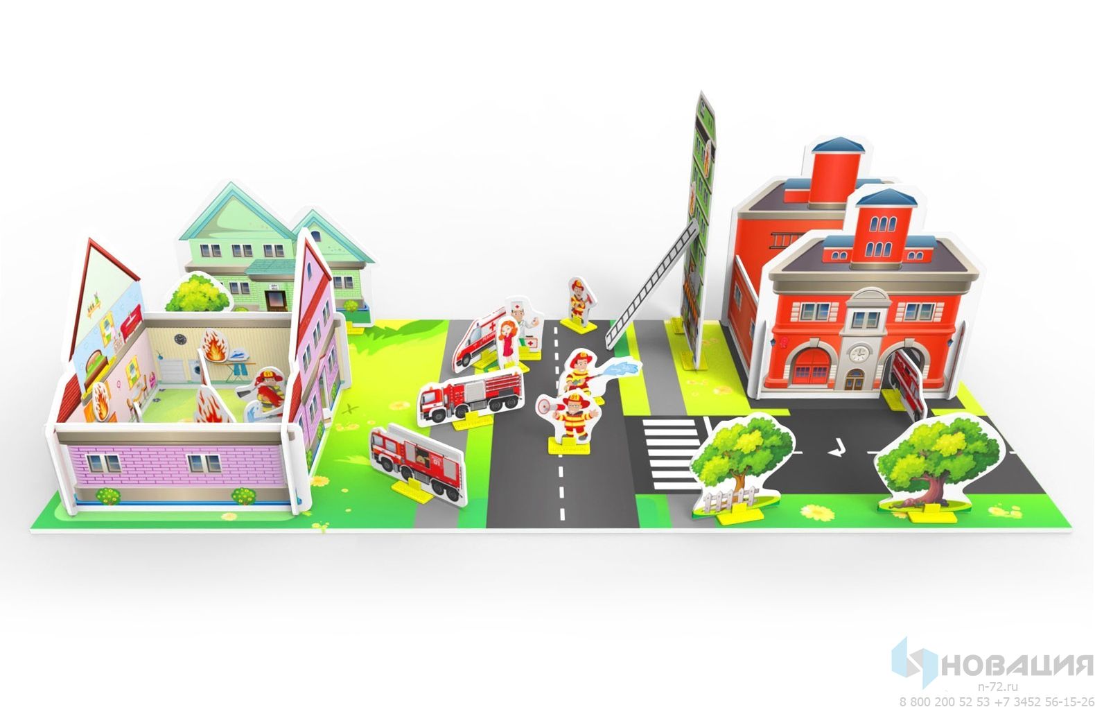 Макет представлен имитацией зданий и дороги, фигурками деревьев и пожарных, служебных машин. Светящиеся элементы, изображающие огонь, крепятся на миниатюрные домики. Правила тушения пожара запомнятся с легкостью, если дошкольник разыграет сценку, действующие лица которой ликвидируют возгорание.