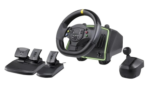 Устройство дополнено двумя встроенными вибромоторами для точной тактильной отдачи, подрулевыми переключателями и 4‑позиционным D‑Pad. Регулируемая чувствительность и возможность настройки угла поворота от 180° до 1080° позволяют подобрать параметр под любой стиль игры. Рычаг КПП, педали газ, тормоз и сцепление идут в комплекте, а крепление струбцинами надёжно фиксирует руль на столешнице. Корпус выполнен в стильном черном цвете и обшит PVC, что обеспечивает долговечность и комфорт благодаря эргономичному дизайну. Встроенная RGB-подсветка создаёт атмосферу, а ферритовый фильтр снижает помехи для стабильной работы на разных конфигурациях.