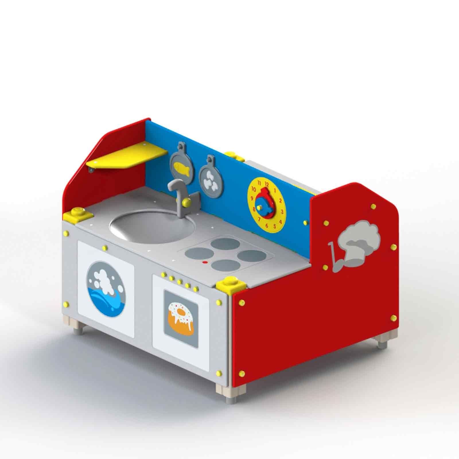 Дополнена имитацией приборов и посуды: выпуклая раковина с краном, духовка, плита с конфорками, полка, посудомоечная машина, весы, часы, сковородки.