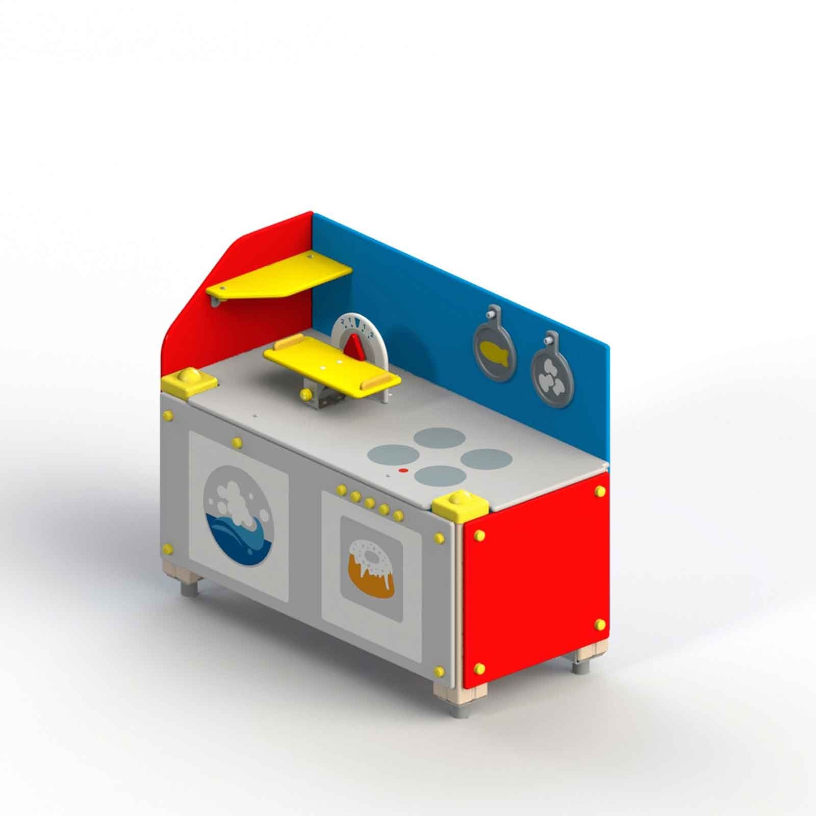 Имитация кухонной обстановки позволит рассказать детям о приготовлении пищи. Модуль односторонний. Рабочая поверхность и стенки с декором держатся на каркасе с опорными столбами. Конструкция дополнена духовкой, плитой с конфорками, полкой, посудомоечной машиной, выпуклой мойкой и краном, часами, сковородками.
