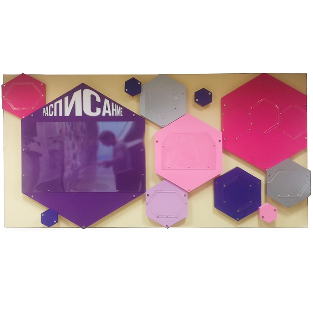 На фигурные элементы наносятся изображения и текст. Разнообразие форм и размеров модулей дает простор для фантазии: блоки стенда стыкуются в разные формы – блоки, цепочки, фигуры. Элементы освещения выделяют панели на фоне остальных деталей интерьера, облегчают восприятие.